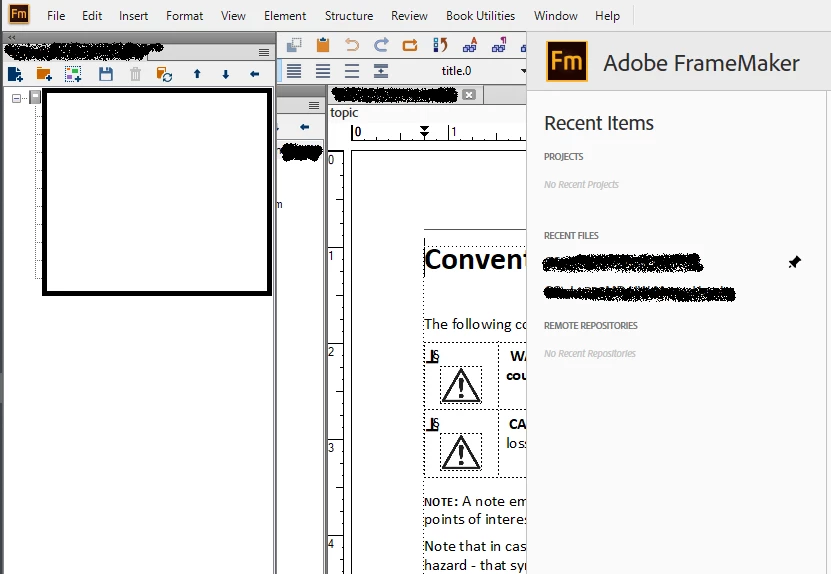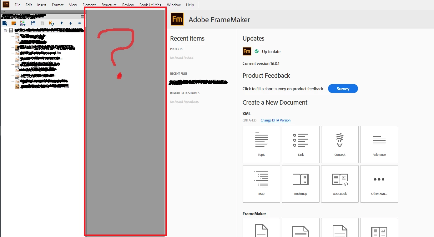 I'm having a weird issue with my Welcome screen where it seems it's always shifted to the right (image below). If I open a document or a book and click on the Welcome screen, that mystery panel fills in with whatever is "behind" it. I have tried a few things to try and fix it, including removing FM and then reinstalling, but it always seems to find a way back. Is there button I've mashed or preference I've enabled? Has anyone seen this and can make it go away? Framemaker is still completely useable but knowing that mystery panel is there is distracting me, and I'm easily distracted. 😞