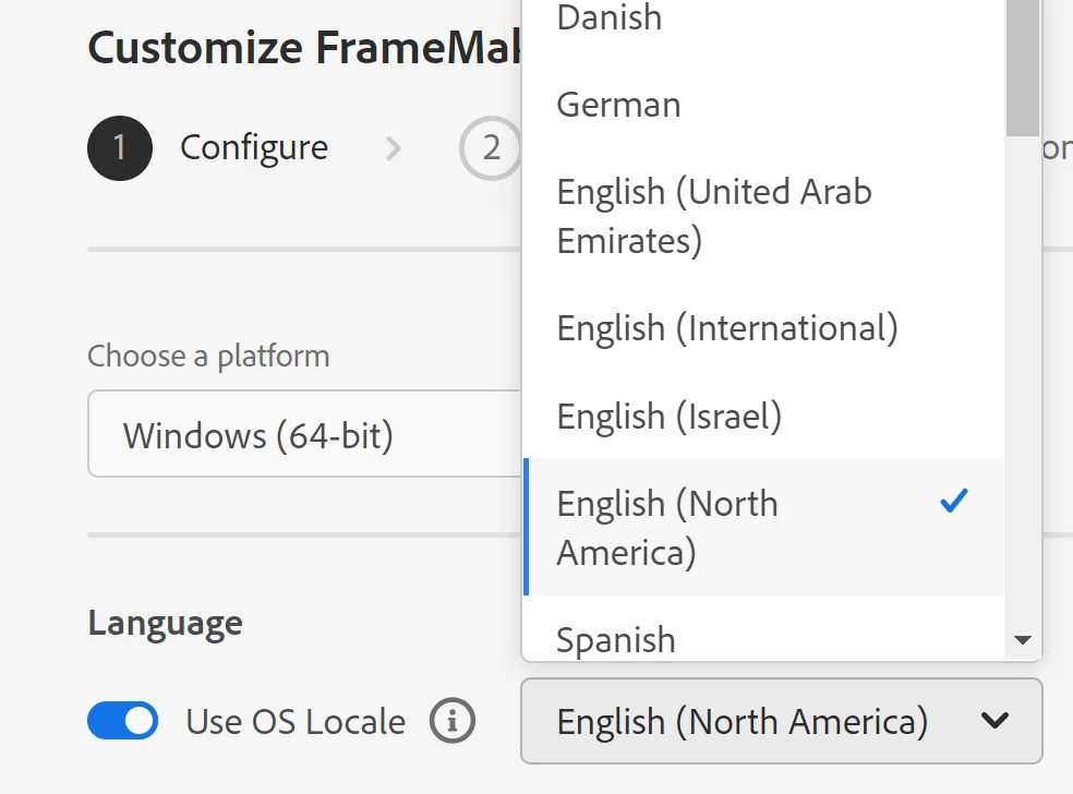 When you install FrameMaker (2019,2020,2022) the version of English can be one of several, however I am particularly interested in North America (aka USEnglish) or International (aka UKEnglish). These options are also available if FrameMaker is packaged in the Adobe Admin Console, as shown below.