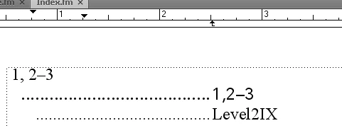 The above paragraphs are formatted as Level1IX, and Level2IX, respectively, on the Ref Pages. When I go to the body pages and click on the text it seems that the correct info is in the Paragraph Designer, BUT NO DOTS or tabs come up.