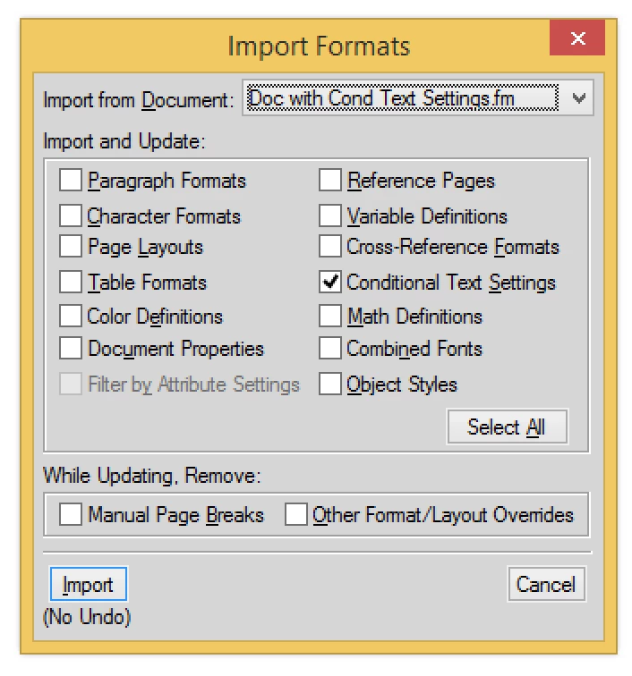 Was working on a doc on a loaner machine. The doc has ample use of conditional text, and 'Show as per Expression' is used to generate the many variants of the doc.