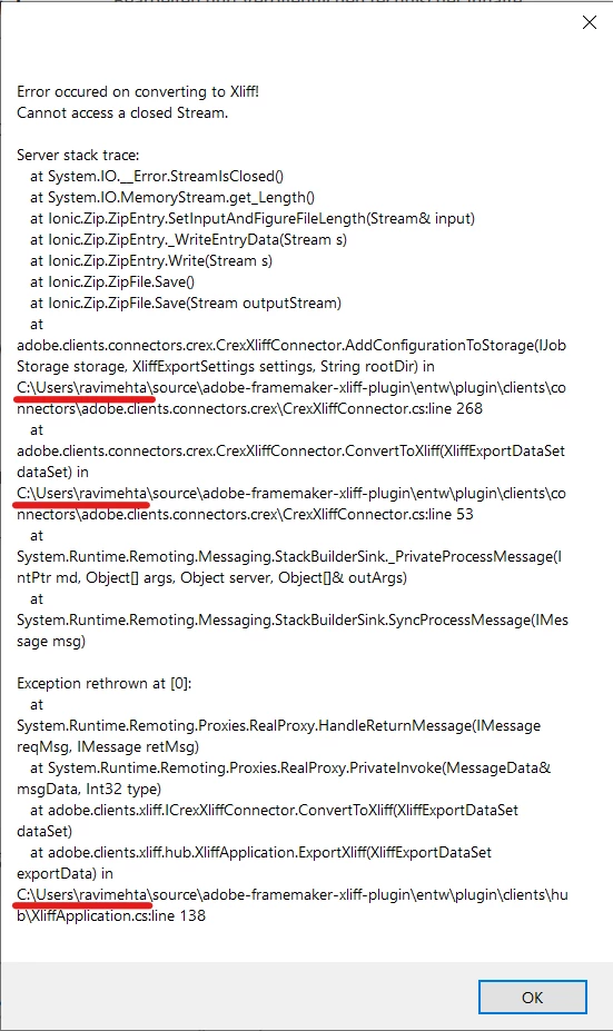 I'm surprised that the error message shows that the exceptions are thrown in files under C:\users\ravimetha\source\adobe-framemaker-xliff-plugin\entw\plugin\clients\… (see screenshot above)