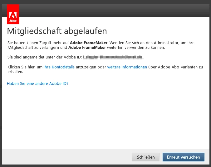 Erst nach dem wir die User in der Adobe Admin Console entfernt hatten und wieder neu hinzugefügt haben, konnten sich die User wieder anmelden. Jedoch wurde danach automatisch FM 2020 heruntergeladen und installiert. Ein Loginversuche bei FM2017 wurden mit der obigen Fehlermeldung quittiert.