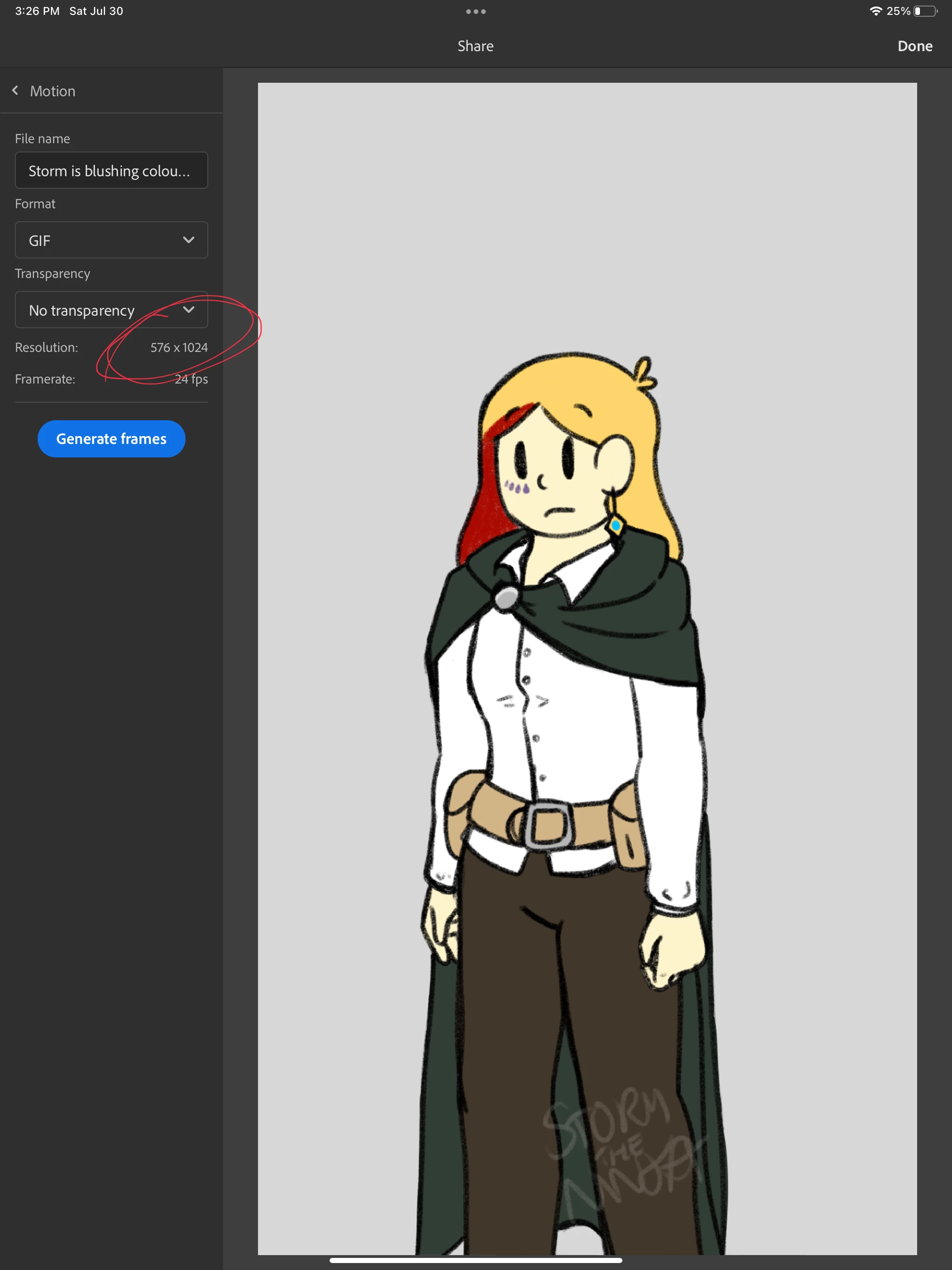 So here's an issue I've found with Adobe Fresco's animation/motion features. I've been animating on canvases that are always at least 1080 x 1920 (HD), and this gif was animated on a 2160 x 3840 px canvas, 266 dpi (though that doesn't really matter since this is a digital file and not to print). However, every time I go to export it, it decides to export at 576 x 1024 px. This doesn't change even as I raise canvas size, up the fps, nothing I find is allowing me to export at a higher setting.
