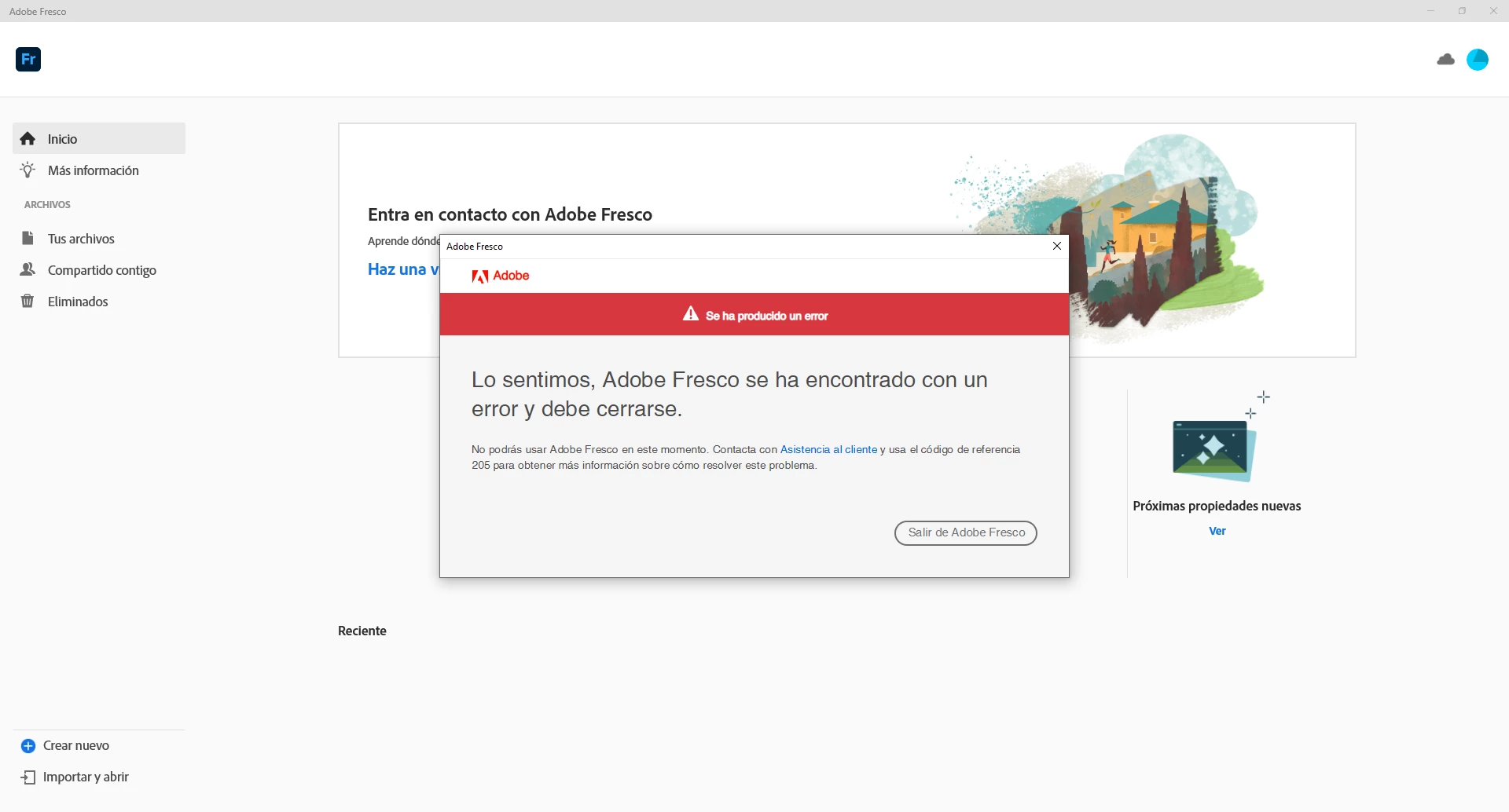 When I start Adobe Fresco error 205 pops up and tells me to close the application.