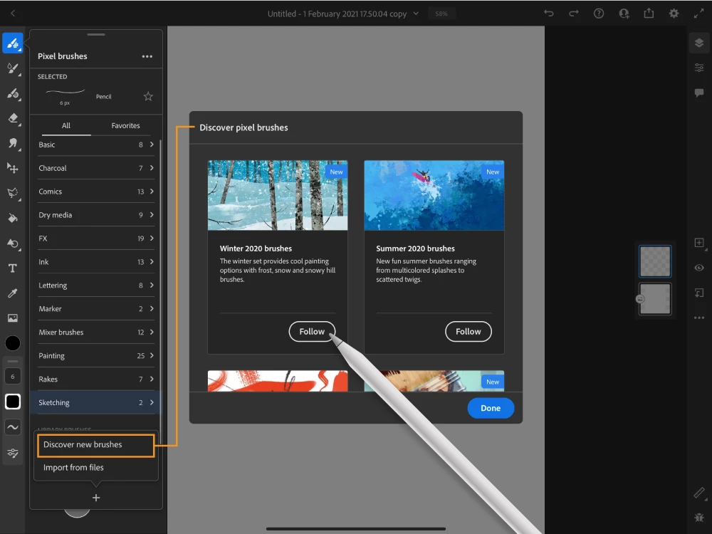3. Winter 2020 brushes: Kyle T. Webster's most recent set includes halftone, marker and wild grass brushes along with a duo of Snowy Hills brushes inspired by legendary Disney artist Eyvind Earle. To start painting strokes of this brush pack (you need to be a paid member), tap on Pixel brush menu > + (at the bottom) > Discover new brushes.