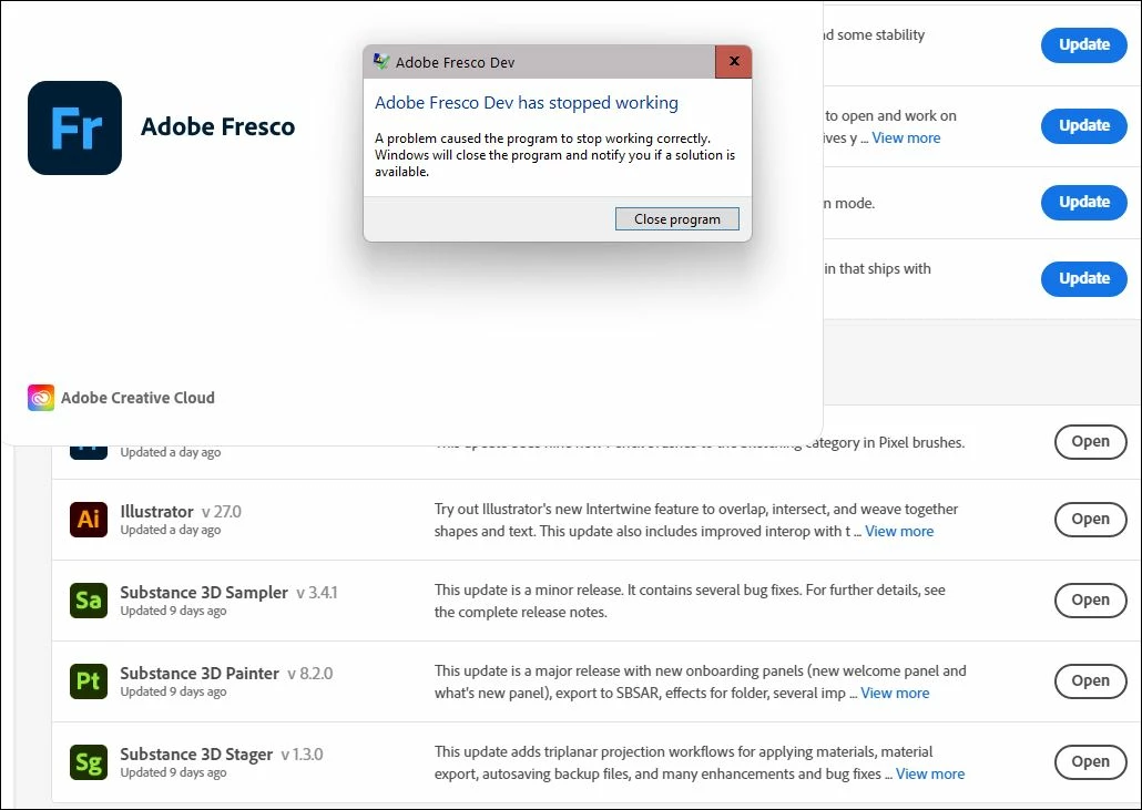 I just updated to Fresco 4.0.0 during Adobe MAX in the past 2 days (Oct. 18-19, 2022) after seeing exciting demos of the product. I now can no longer get Fresco to launch. It crashes every time I try to open from my CC (full plan, all apps) app - which is also up-to-date.