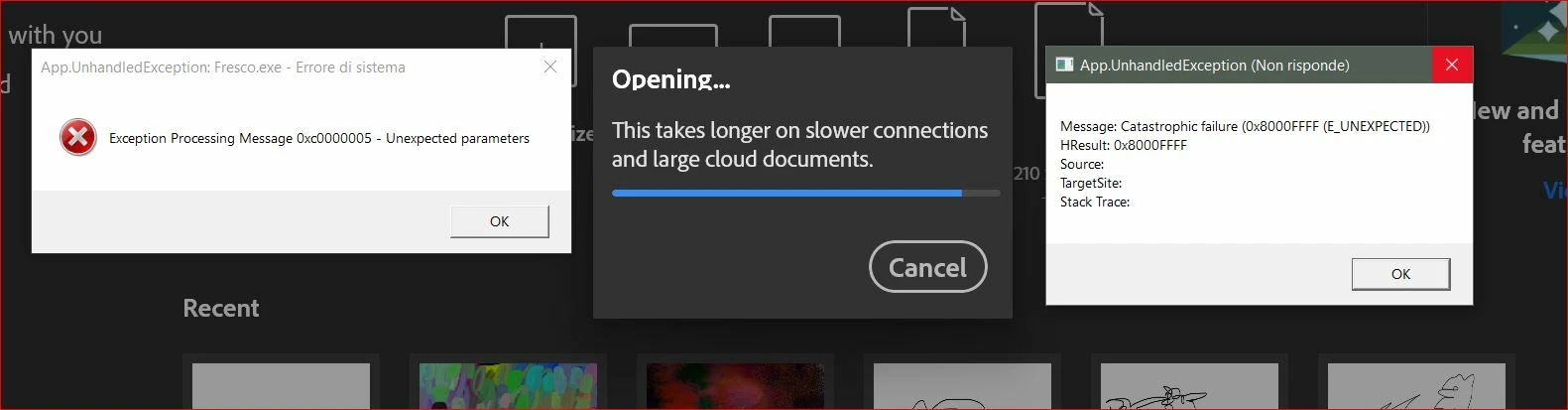 screen at startup and crashes. See screenshot. The new admin account does nothing. I have 450GB of free space and 32GB of RAM. Also I tried Ctrl+Alt+R in Creative Cloud app.