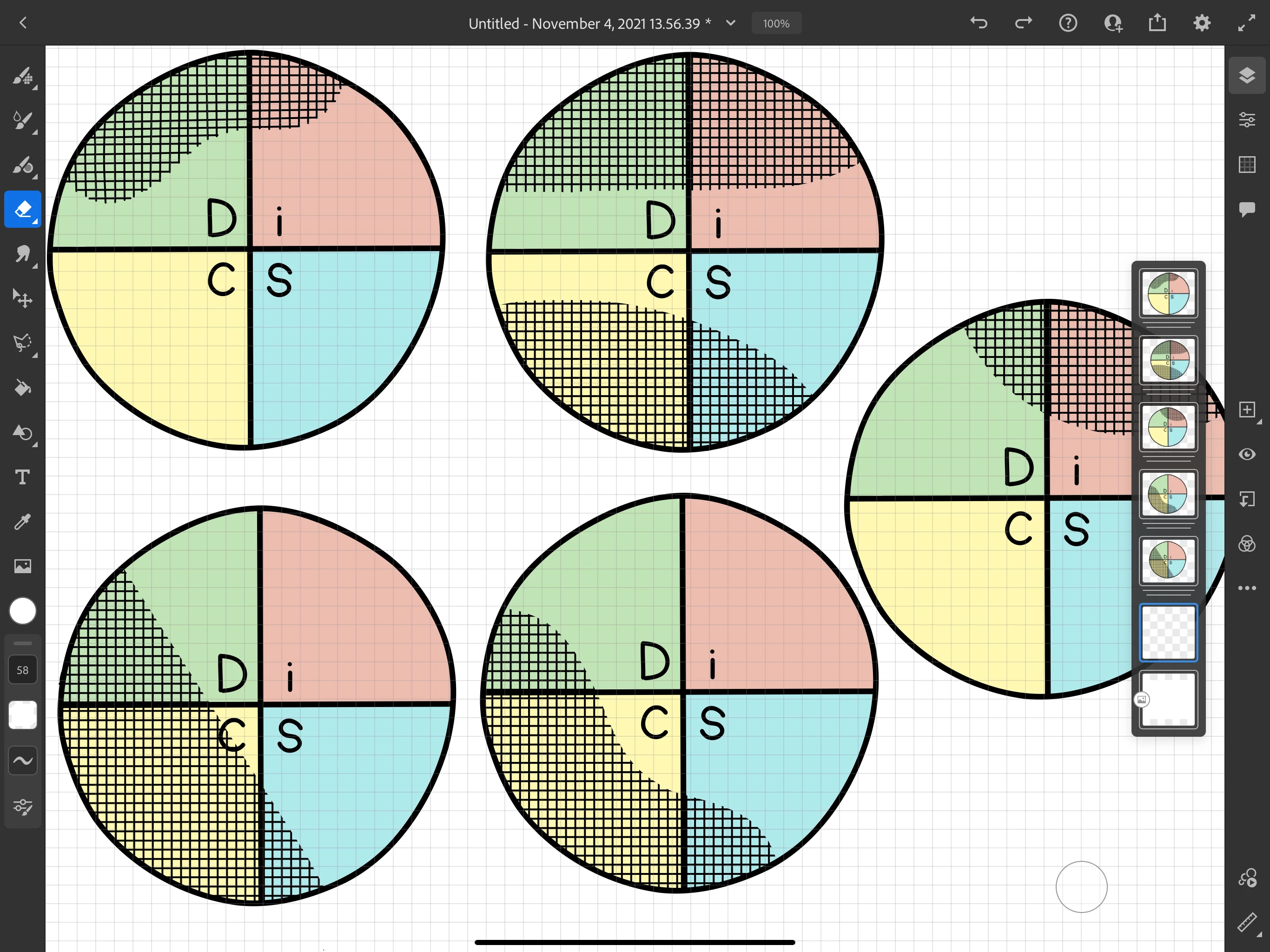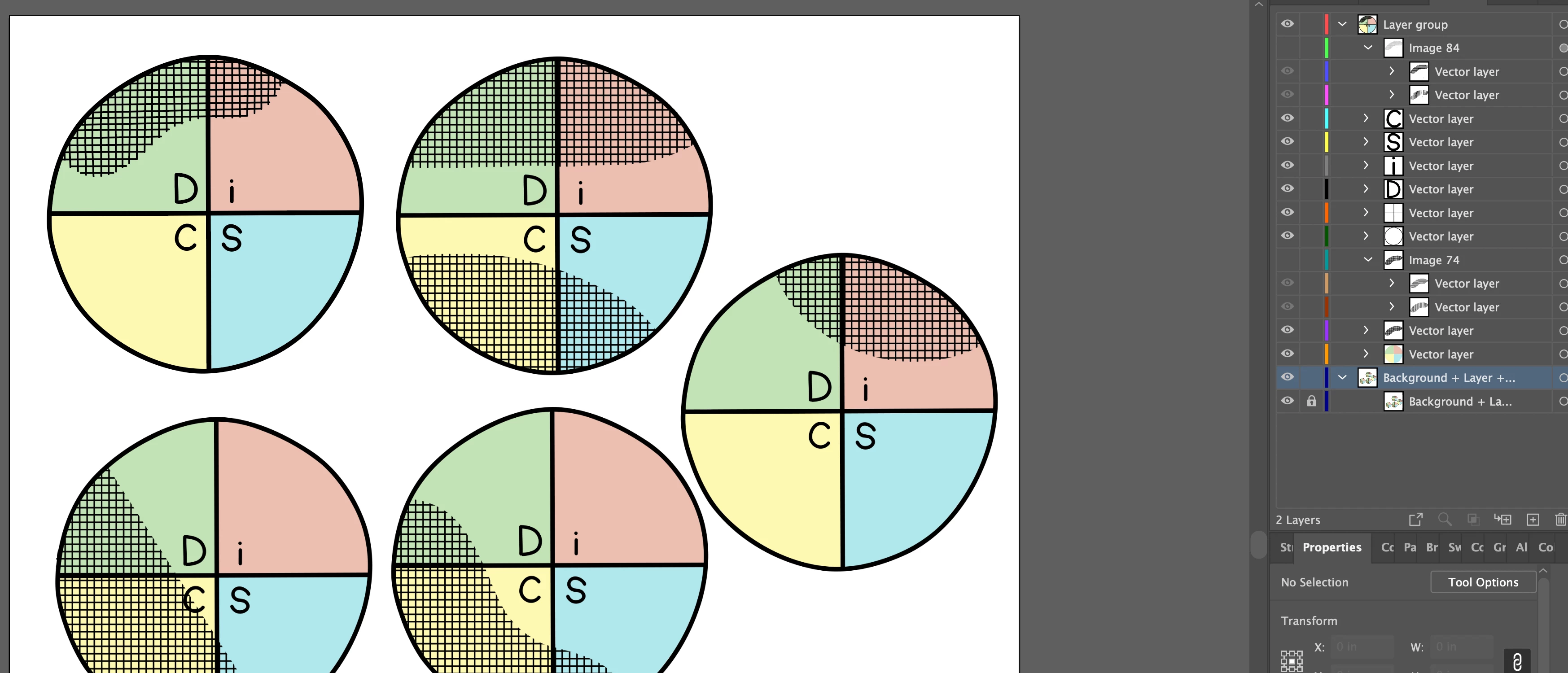 In this case, each circle is a layer group. I'm only getting one circle as a vector layer. The rest are grouped together and pixels. Screenshots below from iPad and desktop Illustrator.