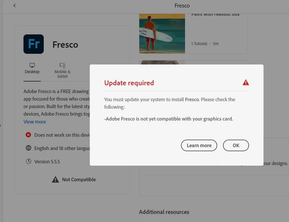 I've been trying to get Adobe Fresco installed for a few days but my creative cloud is reporting that my graphics card is incompatible.