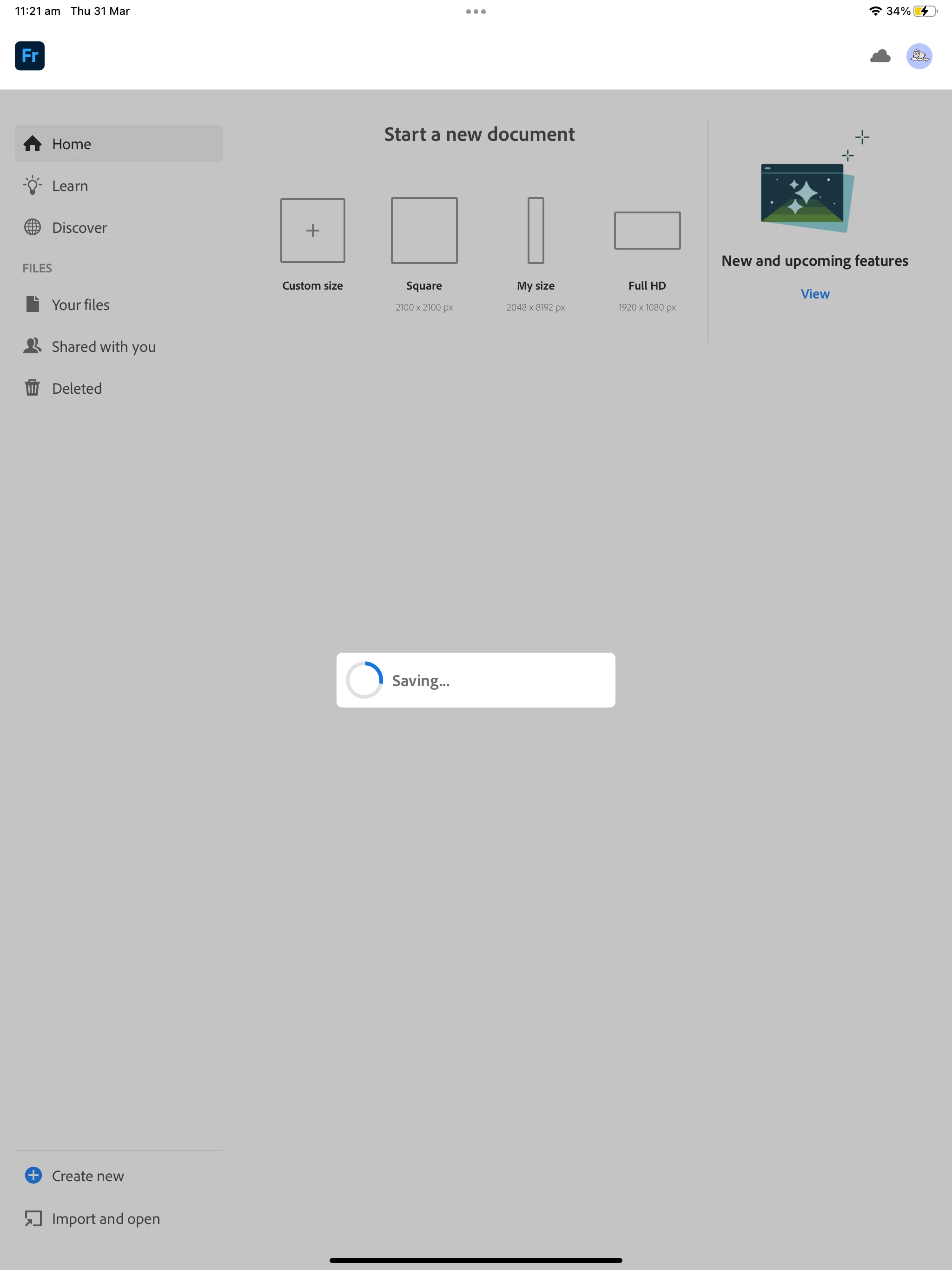 Hi, I'm working with a large file that's very important for my work as a professional illustrator. I went into Adobe Fresco this morning to continue my work and it's forever stuck on the 'Saving' screen, assuming it's still saving my progress from my last session?