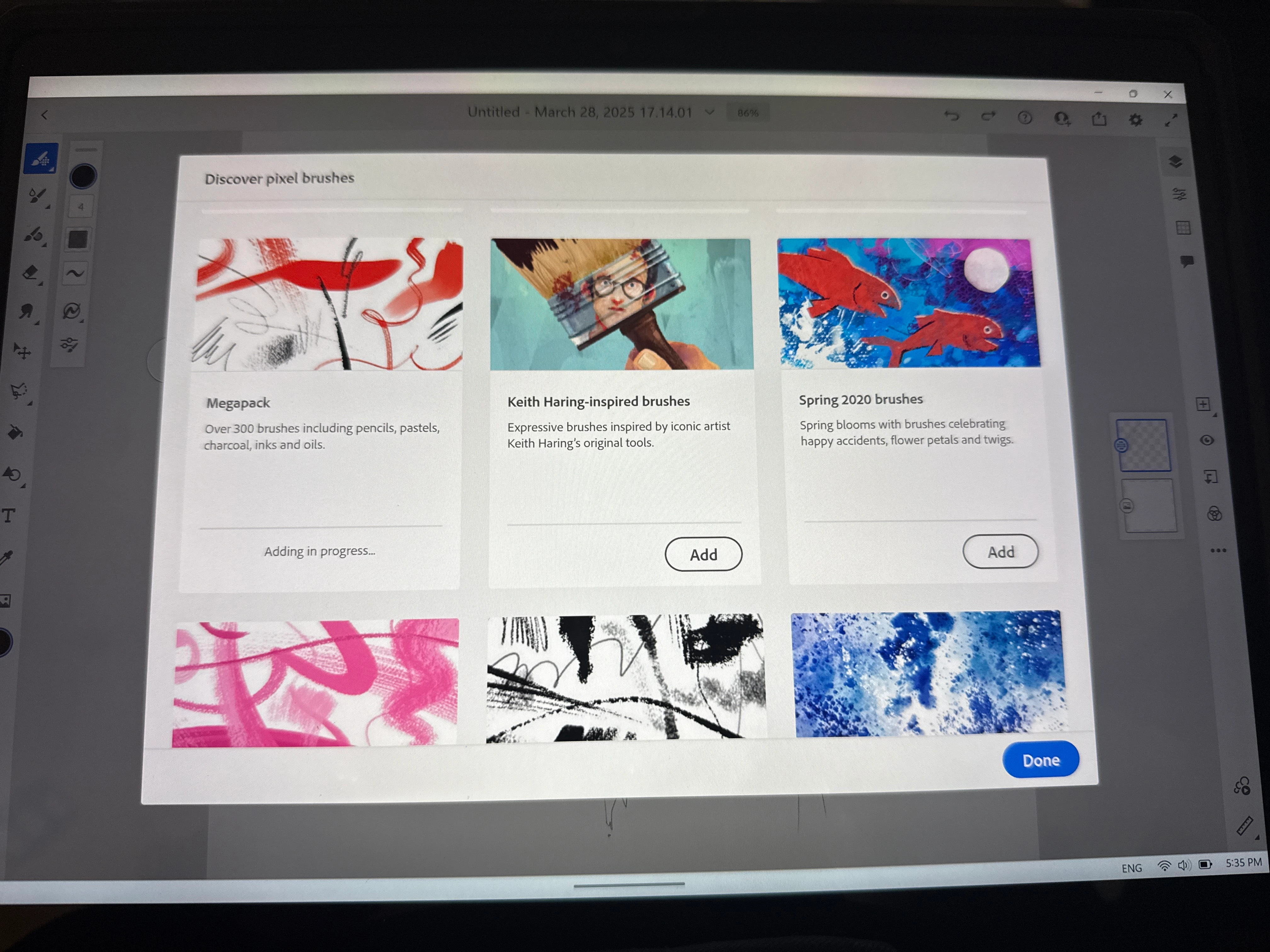 I'm using the latest windows software of fresco 5.5.5 and I'm having trouble adding any brush sets. It never changes from adding in progress. Is there a workaround? I'm on my Microsoft surface tablet.