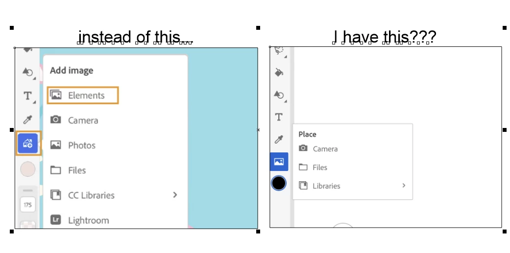 I've been using Fresco for years, and I just realized the version I am using isn't the latest, greatest version even though it is up-to-date. No idea what is going on. I just updated to version 5.7 but I am missing some features. For example, the screenshot below shows the "add images" tab on the left with all the cool new features like "Elements" and my boring old version on the right. Anybody have any ideas as to why I don't have the cool stuff?