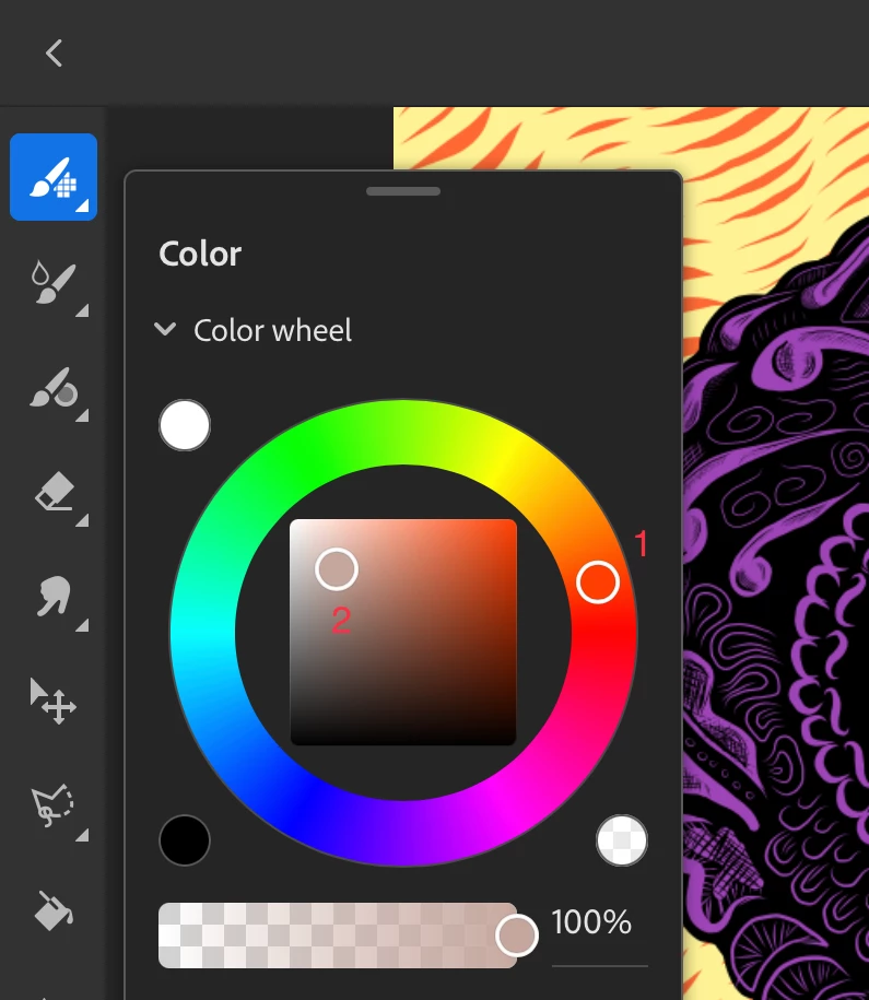 I've been trying to figure out how to use the color wheel to do this but I can't seem to make it work. You can select blackish colors by clicking on the black circle to the lower left of the color wheel. If you click the white circle to the upper left of the color wheel you can select and very light blues, yellows, reds, etc ... but not off-white, beige, grey, brown, etc as far as I can see. What am I missing?
