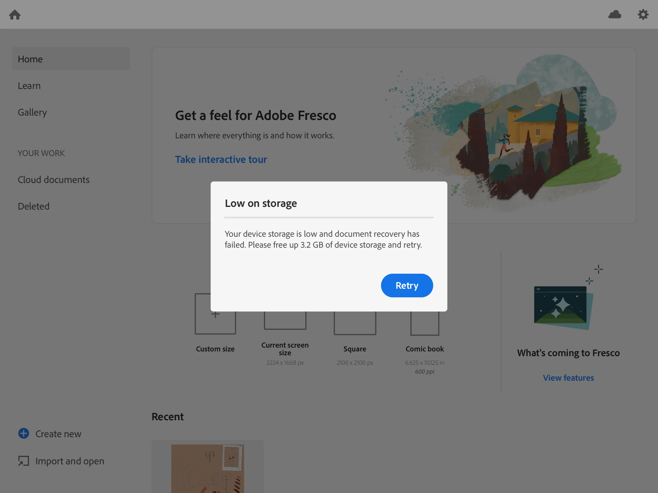 I cannot click retry to free up 3.2 GB of device storage for Adobe fresco on iPad.