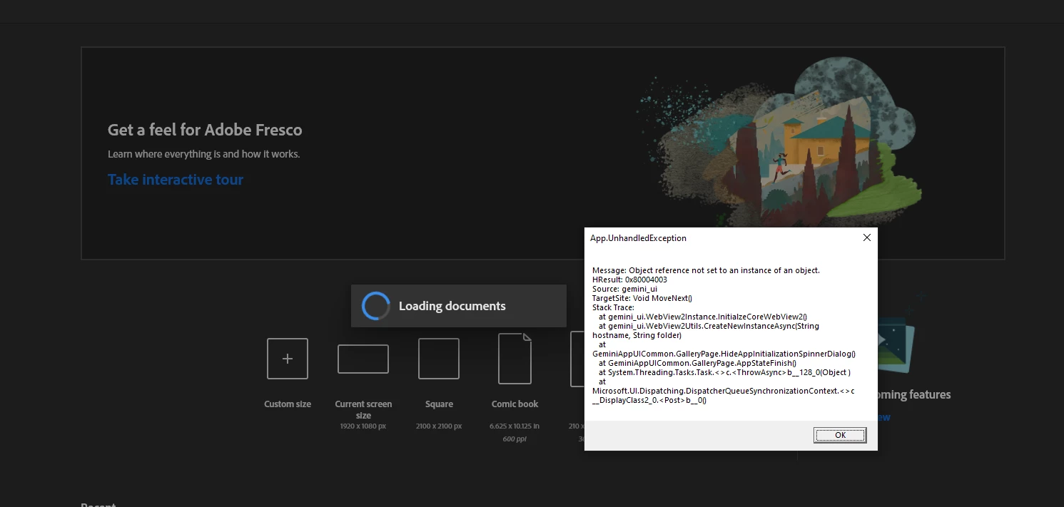 Hi, first time posting to the forums so bare with me. But I donloaded Adobe Fresco today and all I'm getting is the error as seen in the screen cap below and then inifinte loading. I have no idea what that error means, and googling it provided me with nothing but forum posts that basically just equate to gibberish to me.