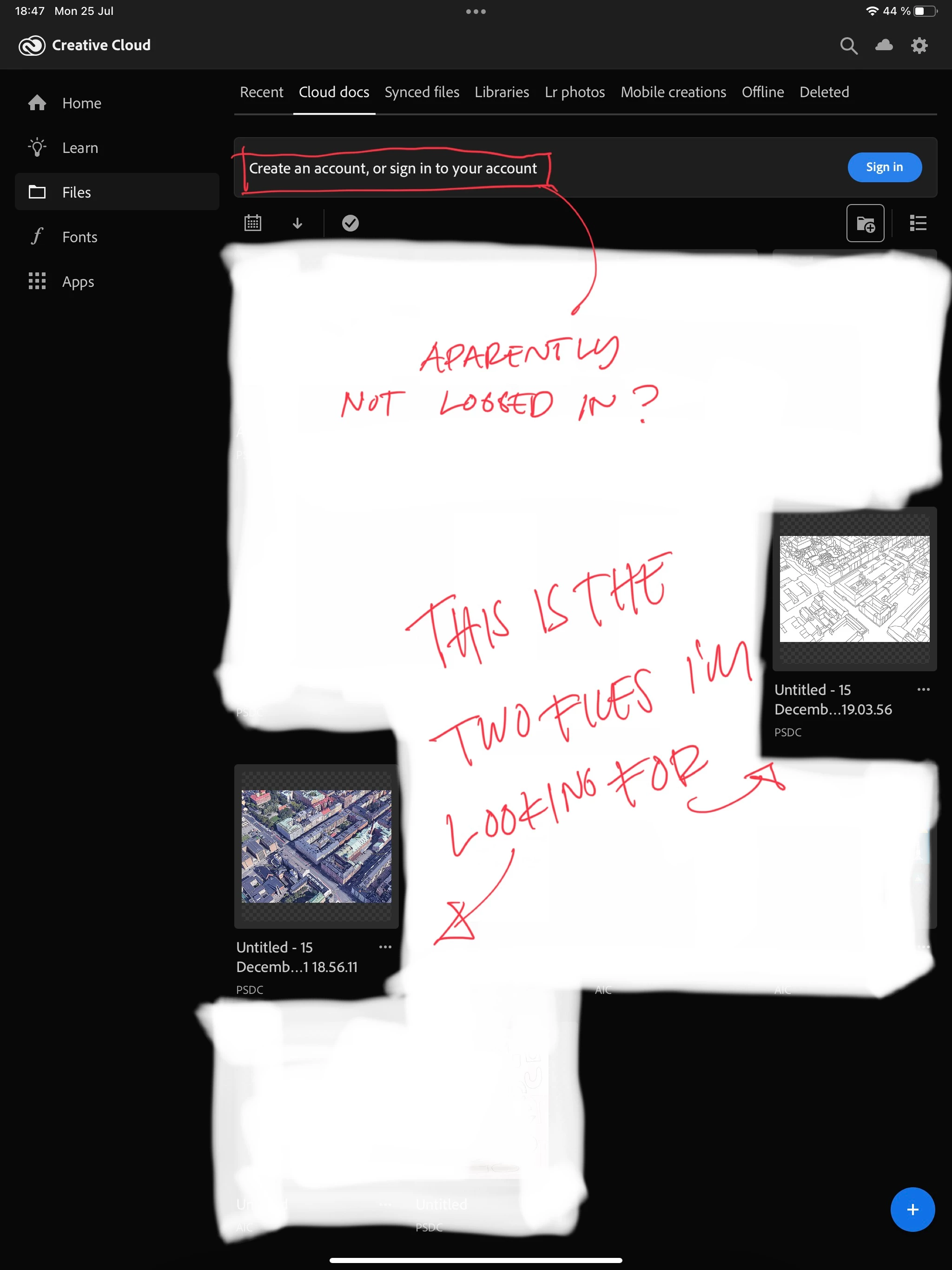 Strange problem with Creative Cloud. Around 6 months ago I was working on a drawing in Adobe Fresco. Been going in and out of the file for a bunch of times so the saving was working then. Now when I'm trying to open the file it's nowhere to be found in my cloud documents in Fresco. However, when I'm opening the Creative Cloud app I can see the file together with a bunch of other old files but I'm not logged in (see attached image) and I can't open it, share it, duplicate it or make it available offline. I can also add that I've logged in to my CC account from several devices and the file is simply not saved to the cloud.