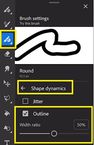 1. The new vector outline brushes are available under shape dynamics. There is a new Command for the outline as shown in the screenshot below:-