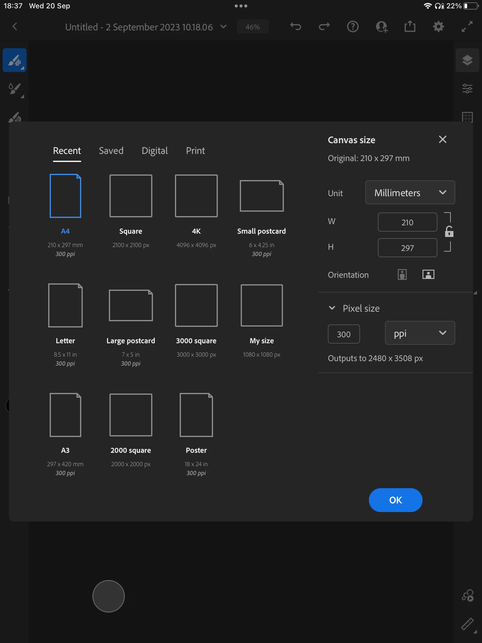 Pous pouvez verifier en appuyant sur la roue dentée a haut a droite de l'interface, en face des dimensions du document, vous avez le texte clickable en bleu "changer". Puis vous voyez la fenetre suivante: