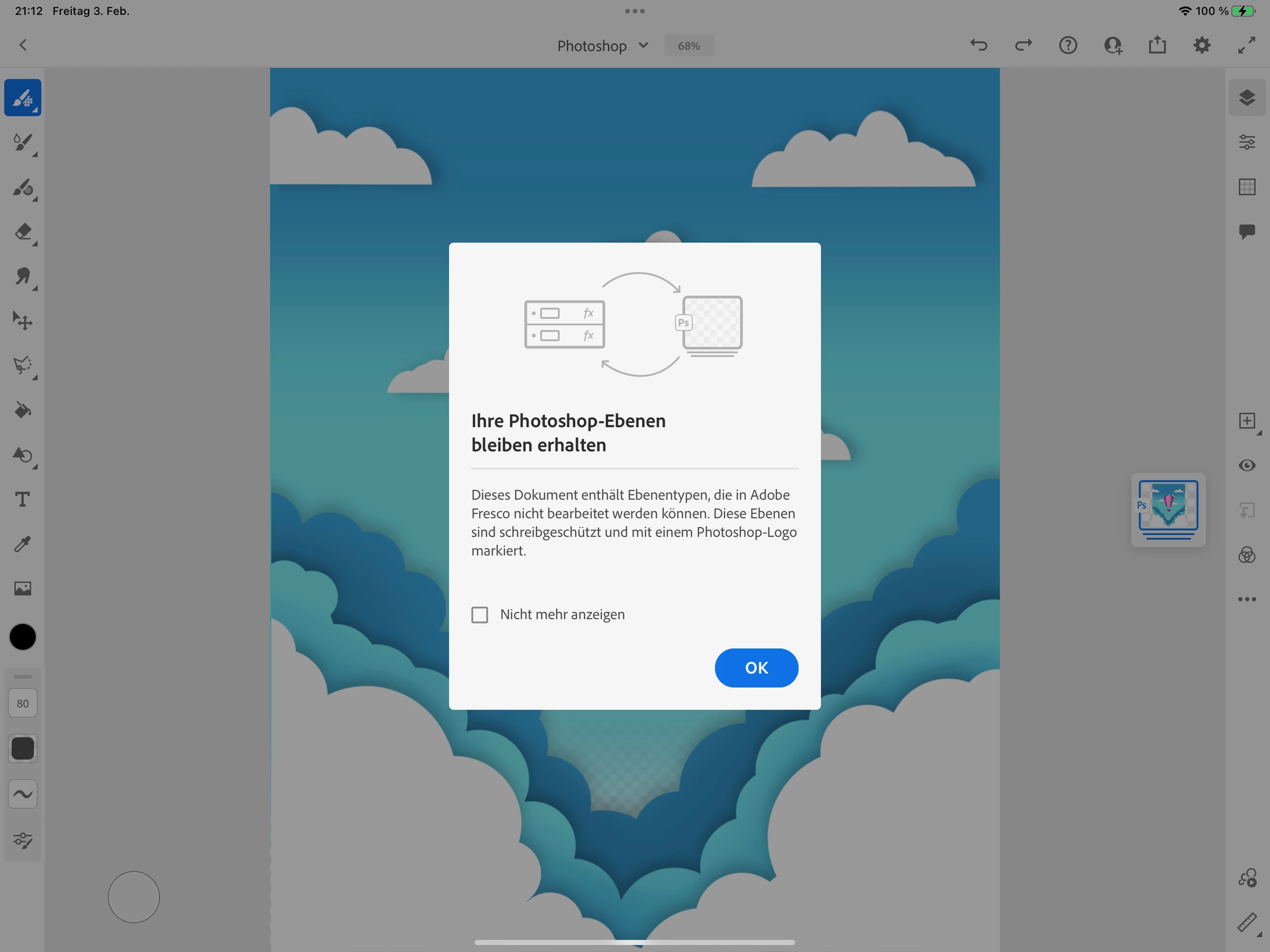 Witzigerweise kann ich jede einzelne Ebene aus ProCreate per Drag and drop in Fresco rüberziehen.