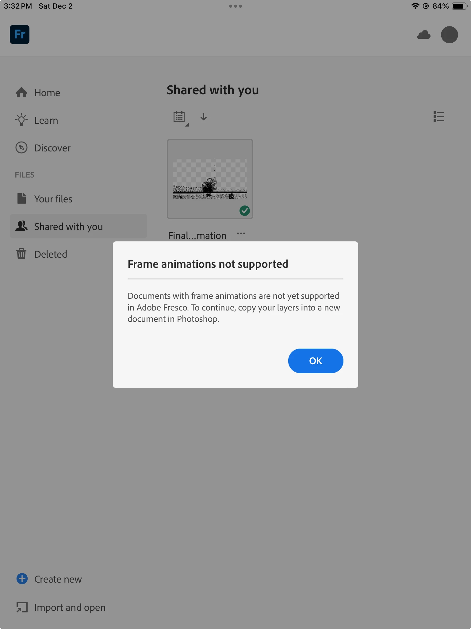 Hi! I am looking for some help with opening up my animation project in Adobe Fresco. After exporting my project to a PSD file I cannot open my Adobe Fresco file without a window popping up. The window says "Frame Animations not Supported," and the descripunder it says "Documents with frame animations are not yet supported in Adobe Fresco. To continue, copy your layers into a new document in Photoshop." I want to be able to open up my original file in Adobe Fresco. Can anyone help?