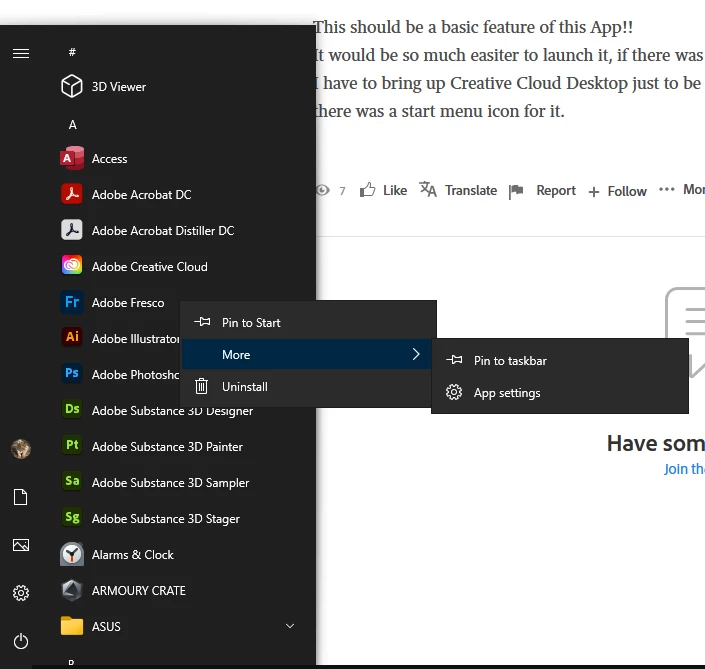 It would be so much easiter to launch it, if there was a start Icon in the start menu or on the desktop. Currently I have to bring up Creative Cloud Desktop just to be able to launch "Fresco". It would be much more efficent if there was a start menu icon for it.