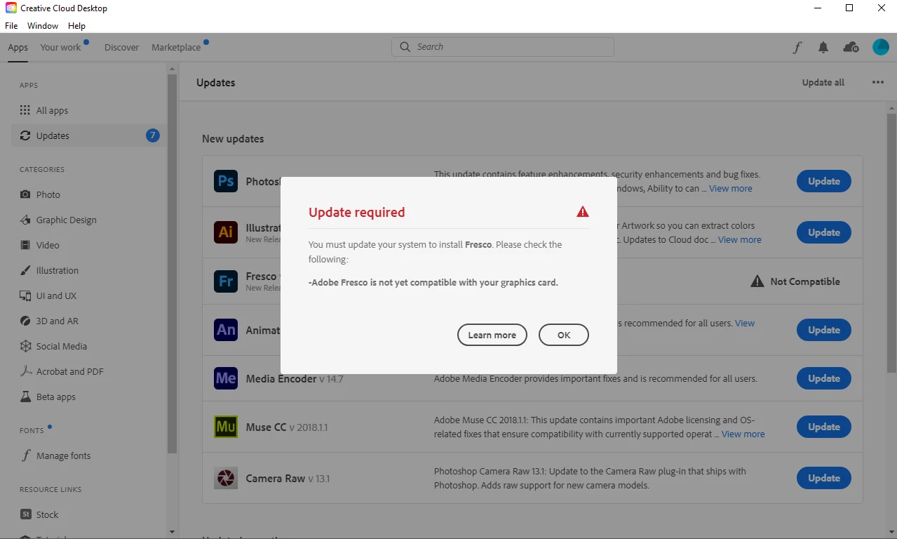 What prevents Fresco V 2.1 from updating/running on my Workstation?