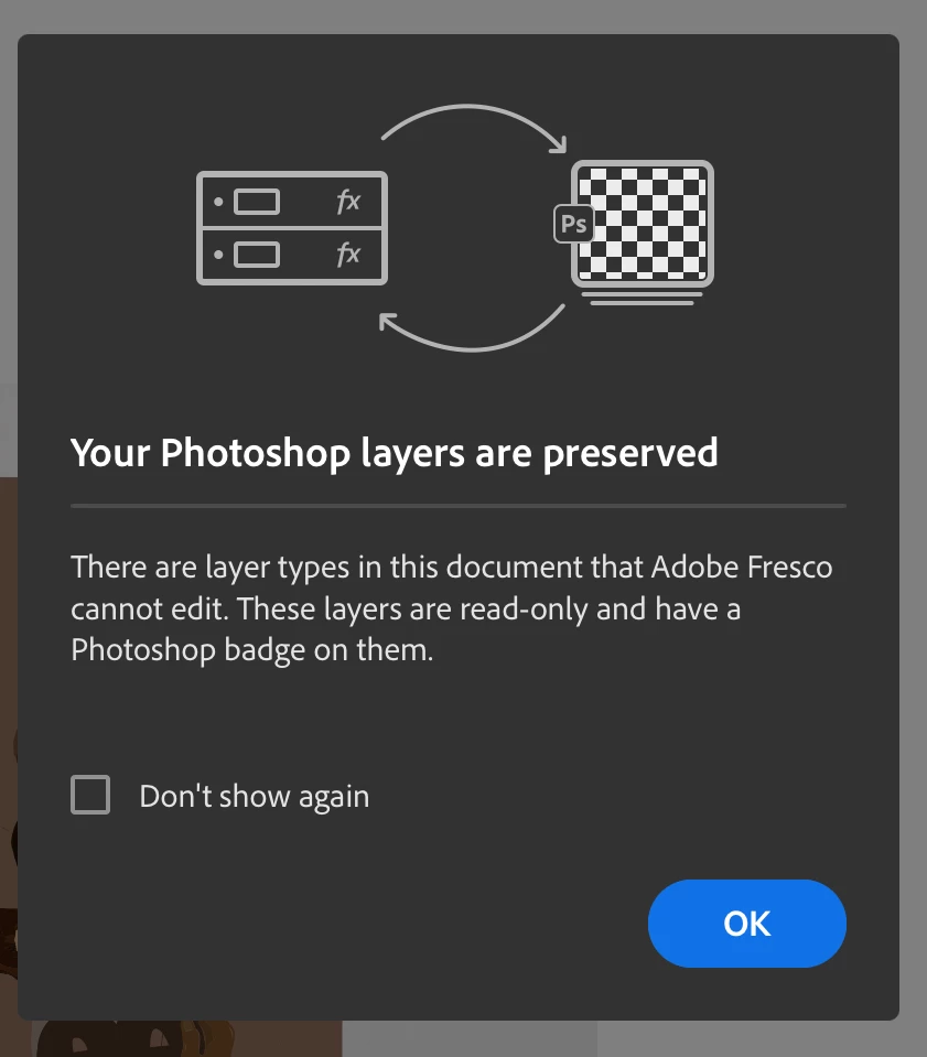 Im trying to open a photoshop psd in Fresco. This imgae was originall created in Fresco and then saved it as a photoshop file. I would like to reopen this psd in fresco but I get this messsage and cant edt my layers. Please help.