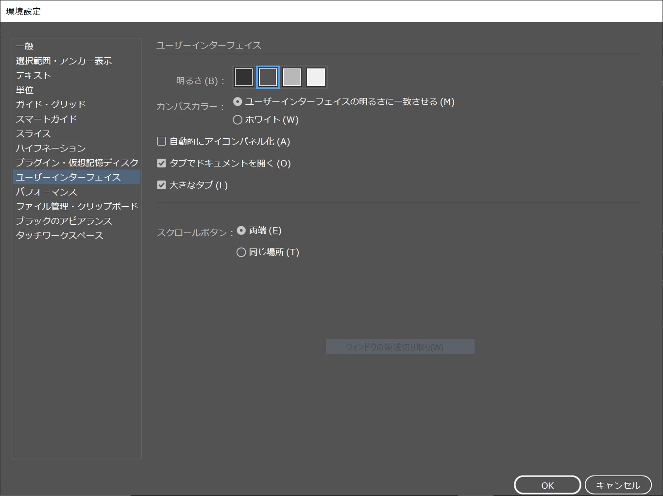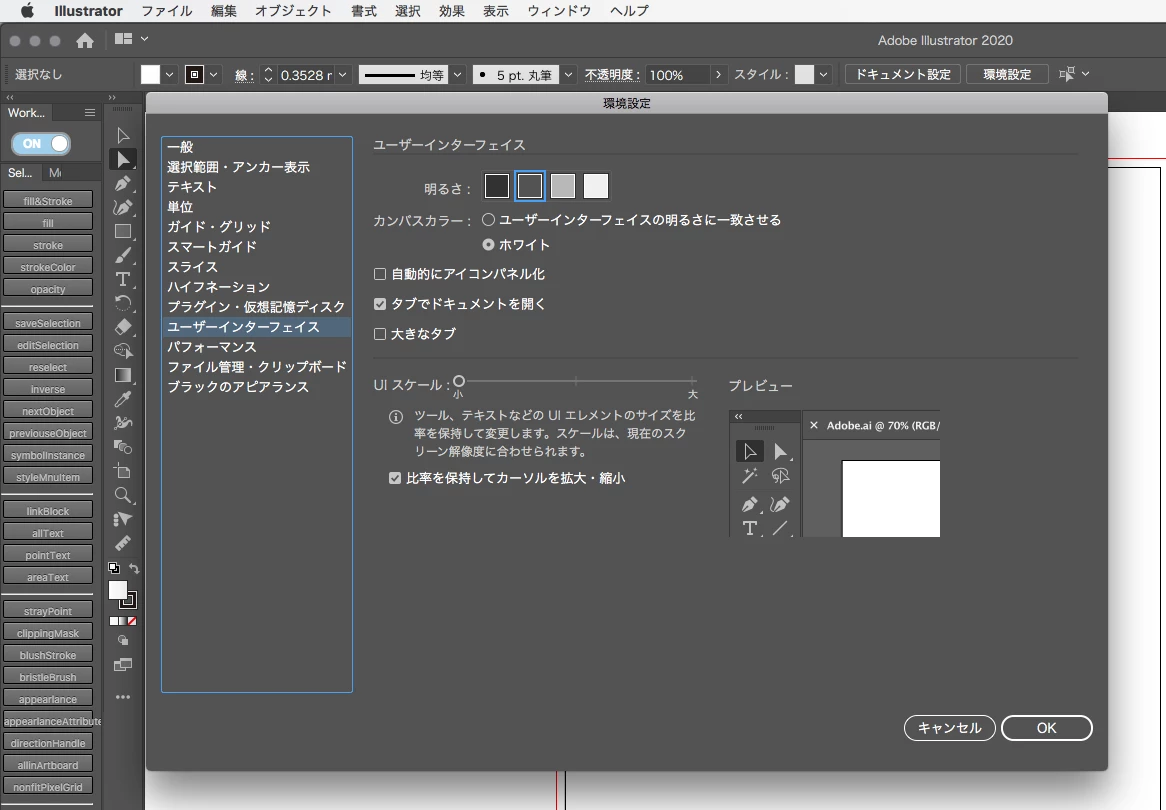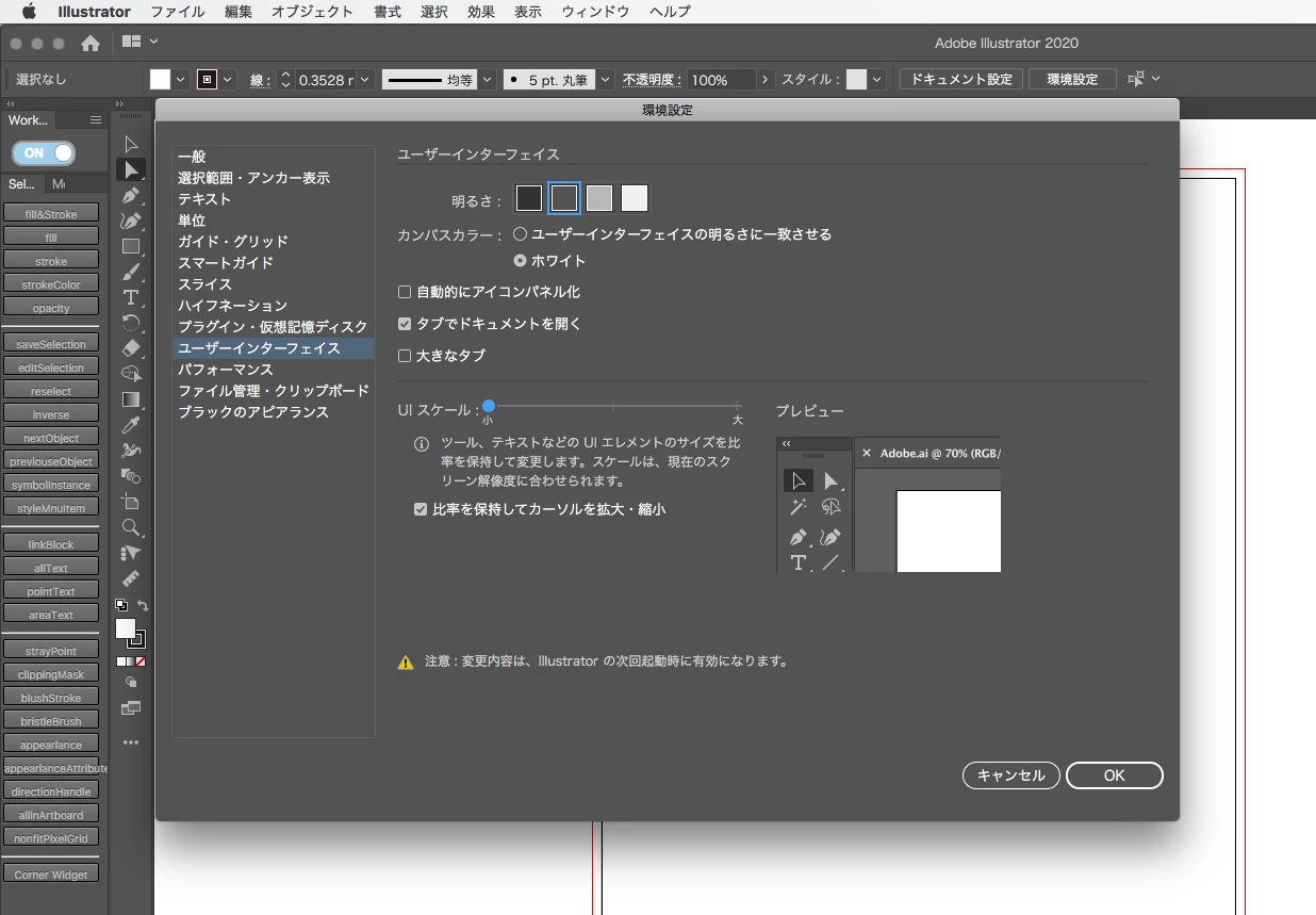 検索したところUIスケールを調整するといいとありましたが、環境設定→ユーザーインターフェースを開いてもどこにもありません。