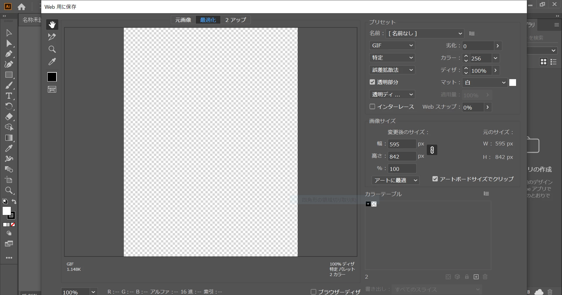 ちなみに「web用に保存」をしたい場合はこのような感じで、保存ボタンが表示されず押せない状態です。