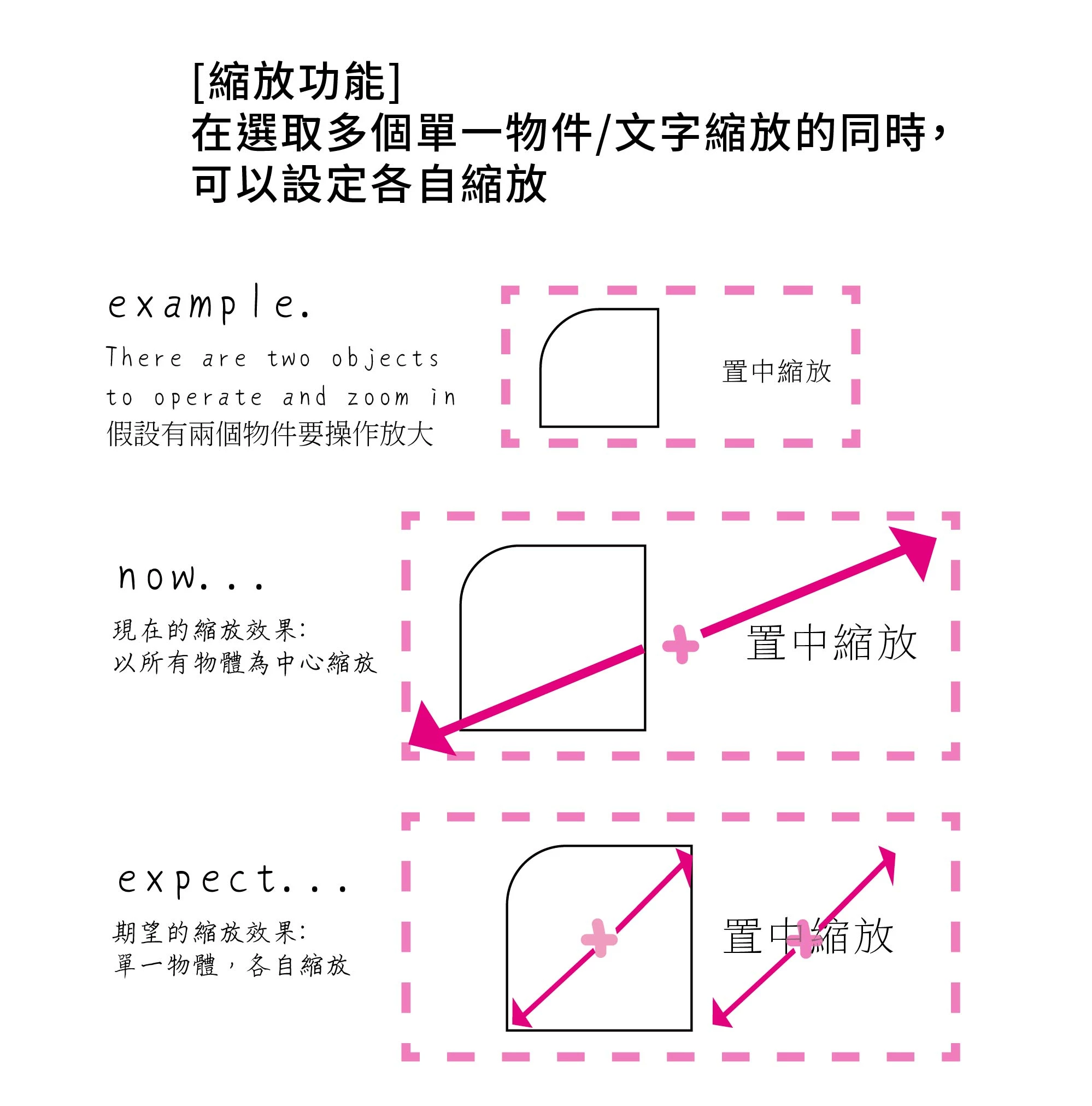 [縮放功能] 在選取多個單一物件/文字縮放的同時, 可以設定各自縮放