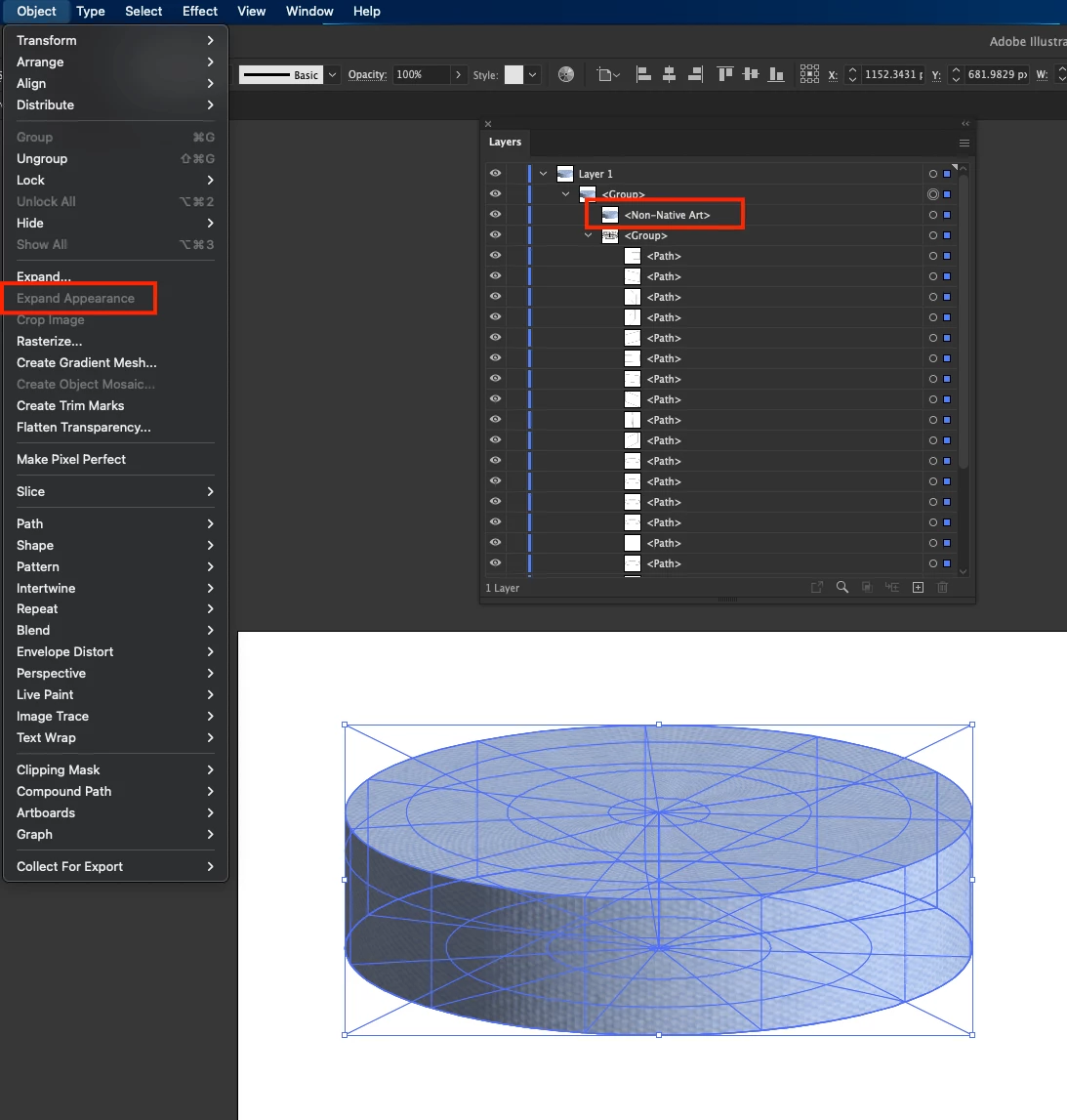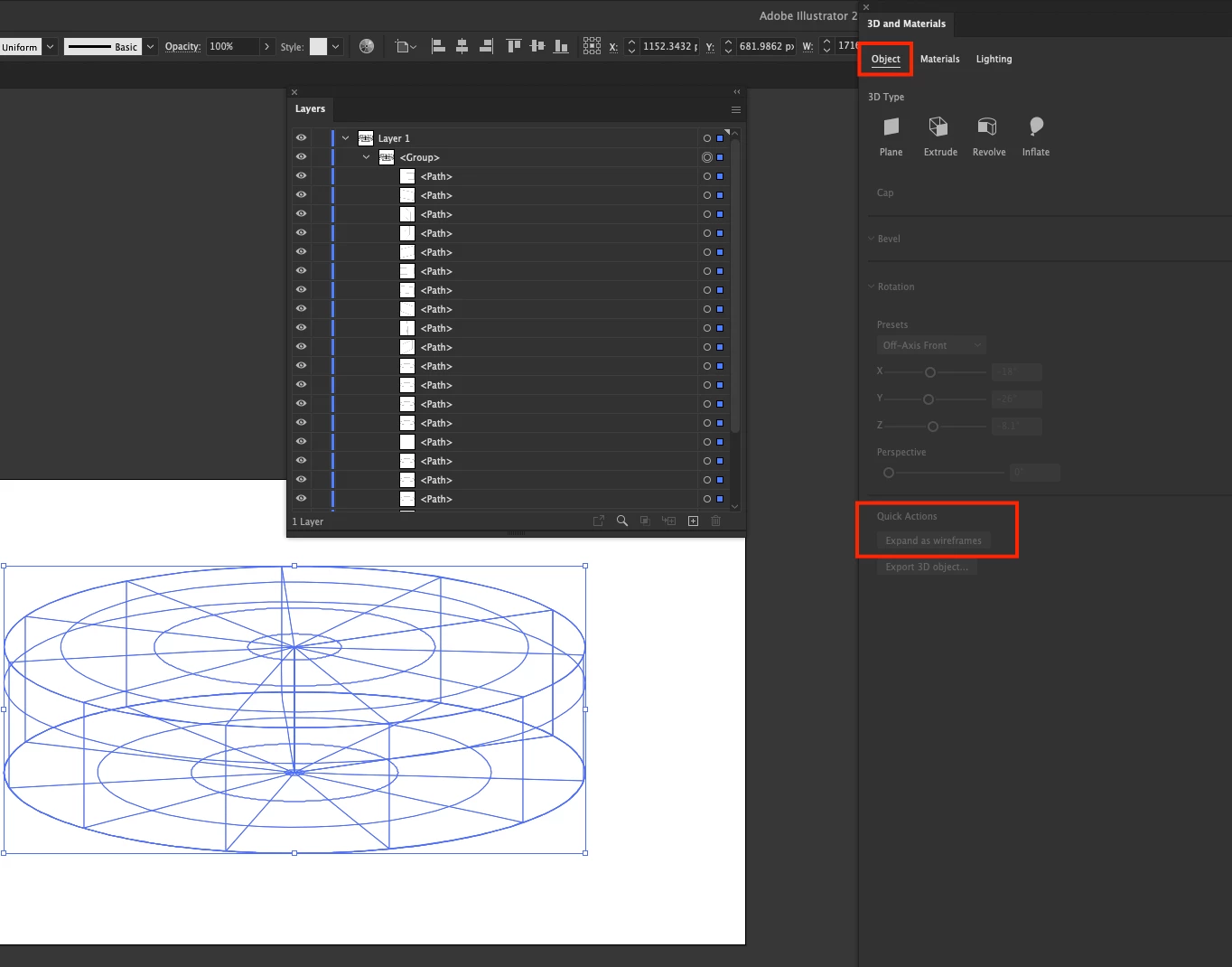 - Expand as wireframes from 3D & Materials panel > Object > Expand as Wireframes.