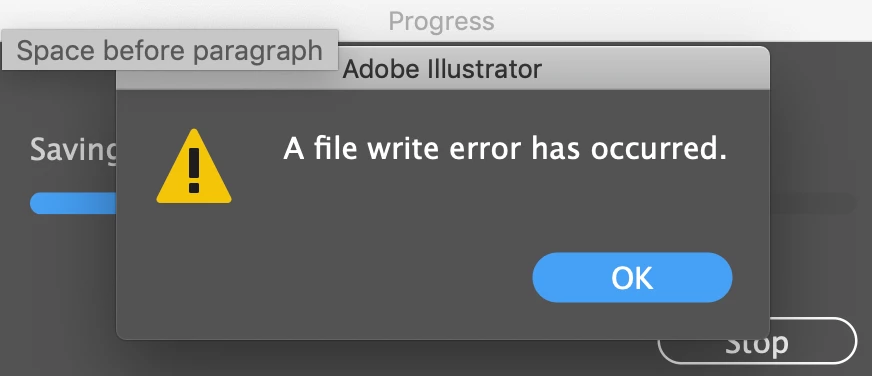 Hi, I have a problem that I cannot save my work in illustrator. Once I saved, It pop up this window and it tells that there is errors. May anyone can help? I need this file very soon! Thanks!