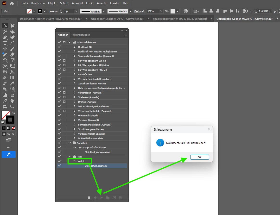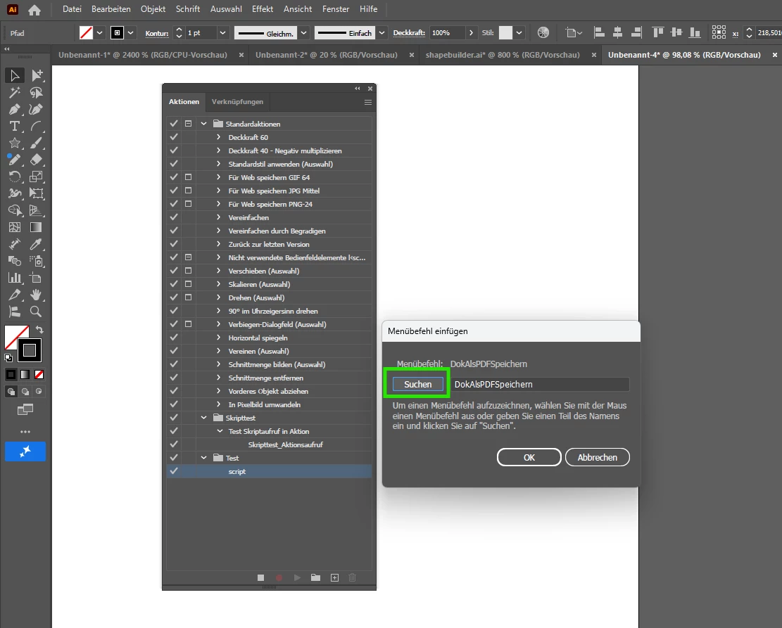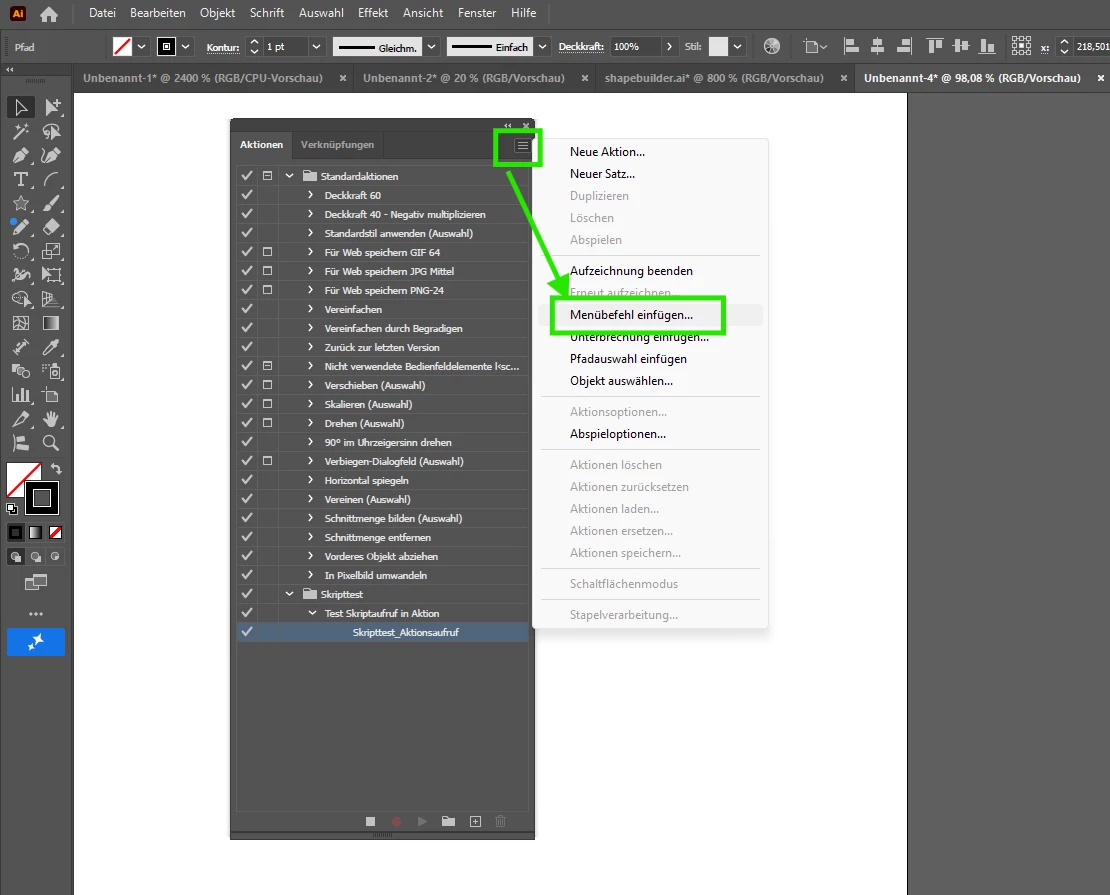 Actions will not record going to the menu ‘File’ and goint to ‘Scripts’ and launching a script. I would like to map a function key to my script. I have an action done in an earlier version of AI so I know this should work. Also I cannot find an ‘Export actions’ anywhere in the flip out menu.