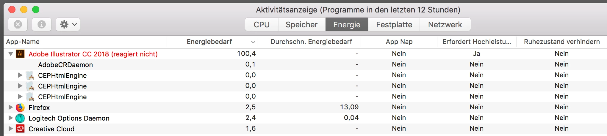 process Adobe Illustrato[17252] thread 282456 caught burning CPU! It used more than 50% CPU over 180 seconds (actual recent usage: 91% over ~98 seconds). Thread lifetime cpu usage 90.083596s, (87.866577 user, 2.217019 sys) ledger balance: 90002628231 mabs credit: 90005355967 mabs debit: 2727736 mabs limit: 90000000000 mabs period: 180000000000 ns last refill: 98403704208 ns.