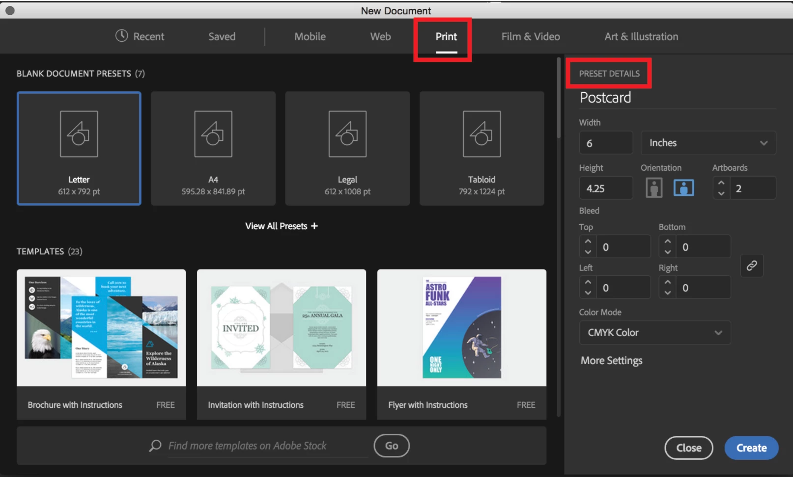 In my book Classroom in a book a workbook from adobe I am asked to create a new document:File>new and I should see a Preset Details area. But there isn't one and on page 79 of the 2017 edition there is a photo of a New Document dialog box that doesn't even exist in Illustrator or I can't get to it and no tutorials show me how. Nor can I get to it without loading up my downloads for this interactive book. Even in the New Document box that does pop up I can't enter more than 1 artboard where it gives you that option. If i do the print option I select reverts to custom and not print. No explanation for this either.
