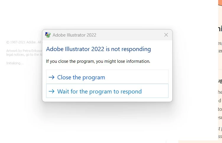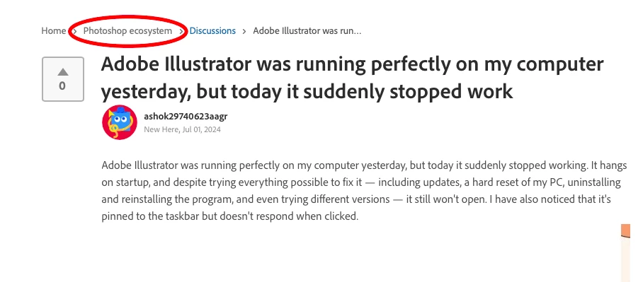 Adobe Illustrator was running perfectly on my computer yesterday, but today it suddenly stopped working. It hangs on startup, and despite trying everything possible to fix it — including updates, a hard reset of my PC, uninstalling and reinstalling the program, and even trying different versions — it still won't open. I have also noticed that it's pinned to the taskbar but doesn't respond when clicked.
