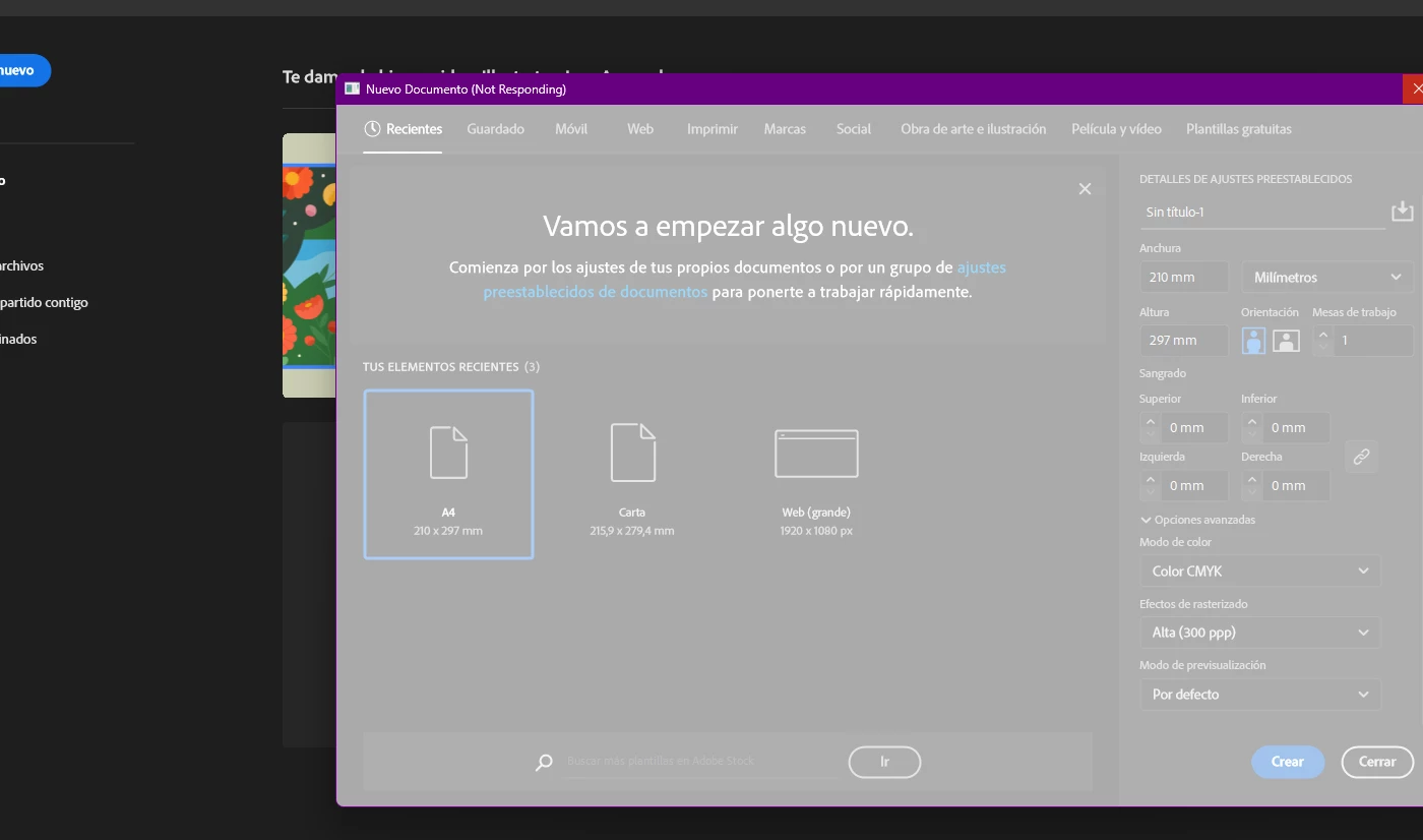 tengo problemas al abrir un nuevo archivo se cuelga adobe illus.