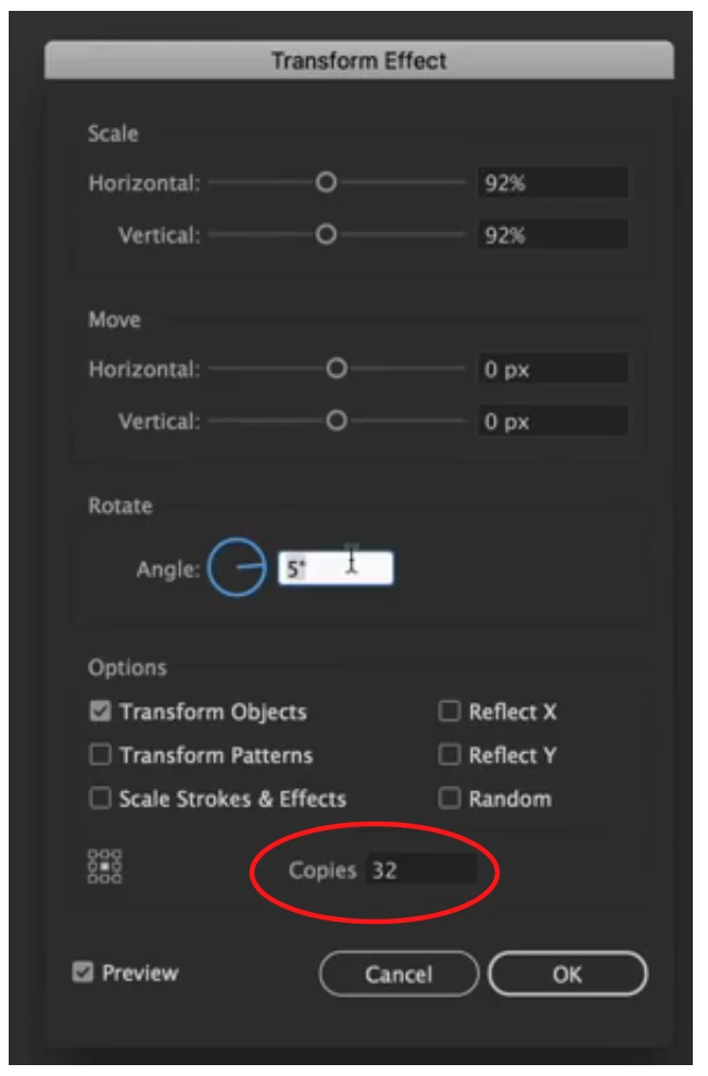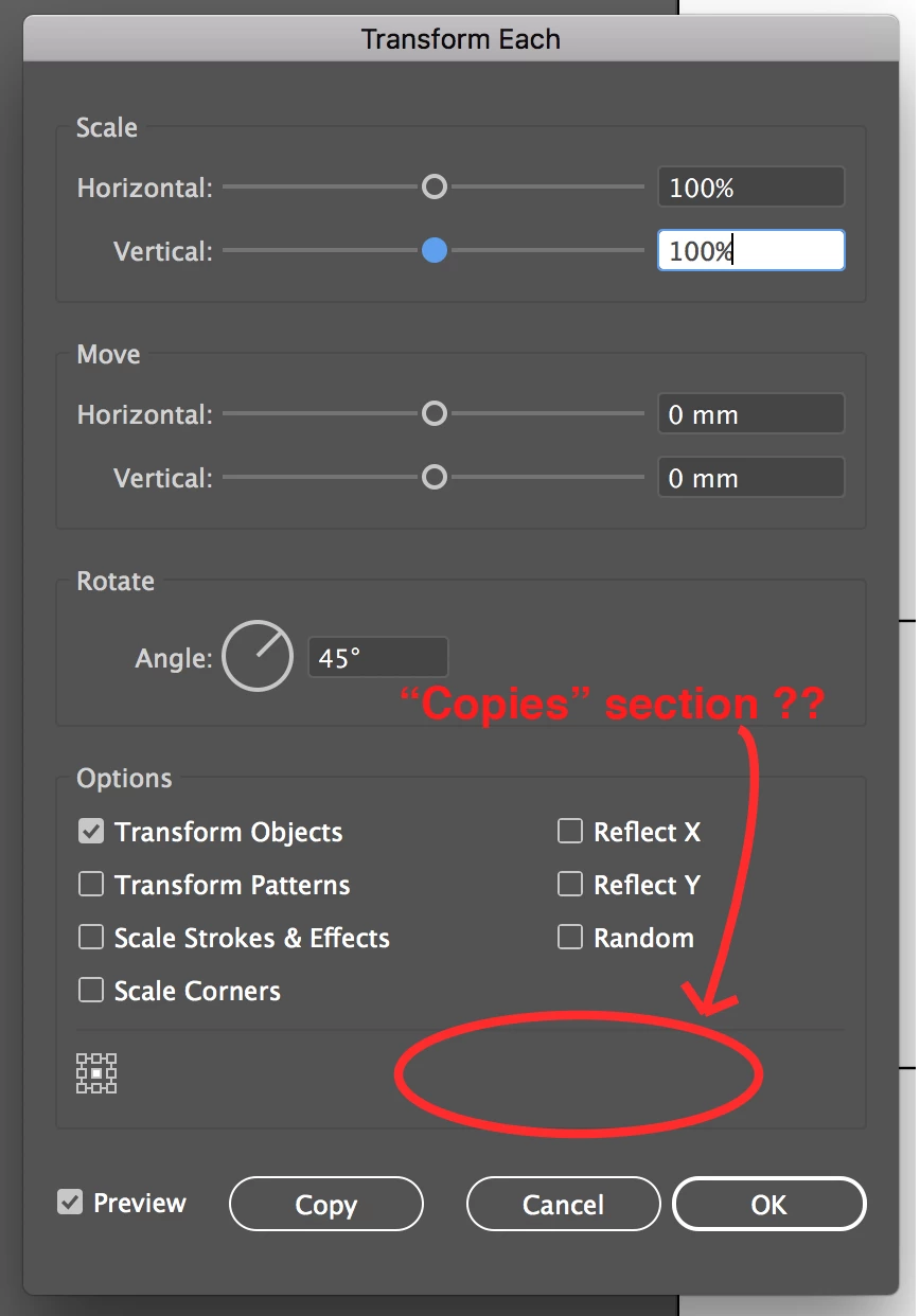 AI CC - Unable to find the "Copies" in "Transform effect " function