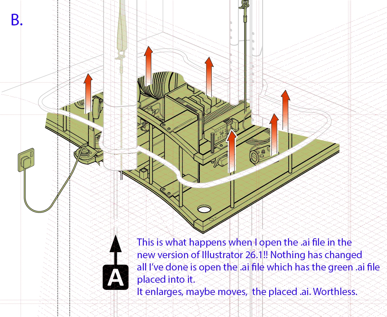 ScreenDump 'B' shows the same illustrator file opened, just opened nothing else, in Illustrator 26.1. Look how much the 'green' placed image has enlarged/moved!!! It's within a mask. As I said there are many versions of this, the idea being that I modify, rename, save as and then replace in Illustrator and it'd put the new version in exactly the same place, same size. That's what used to happen until a few months ago. Anyone any ideas? It'd be a mammoth task to go through the whole manual trying to scale/fit all the placed .ai files to the relevant masks.