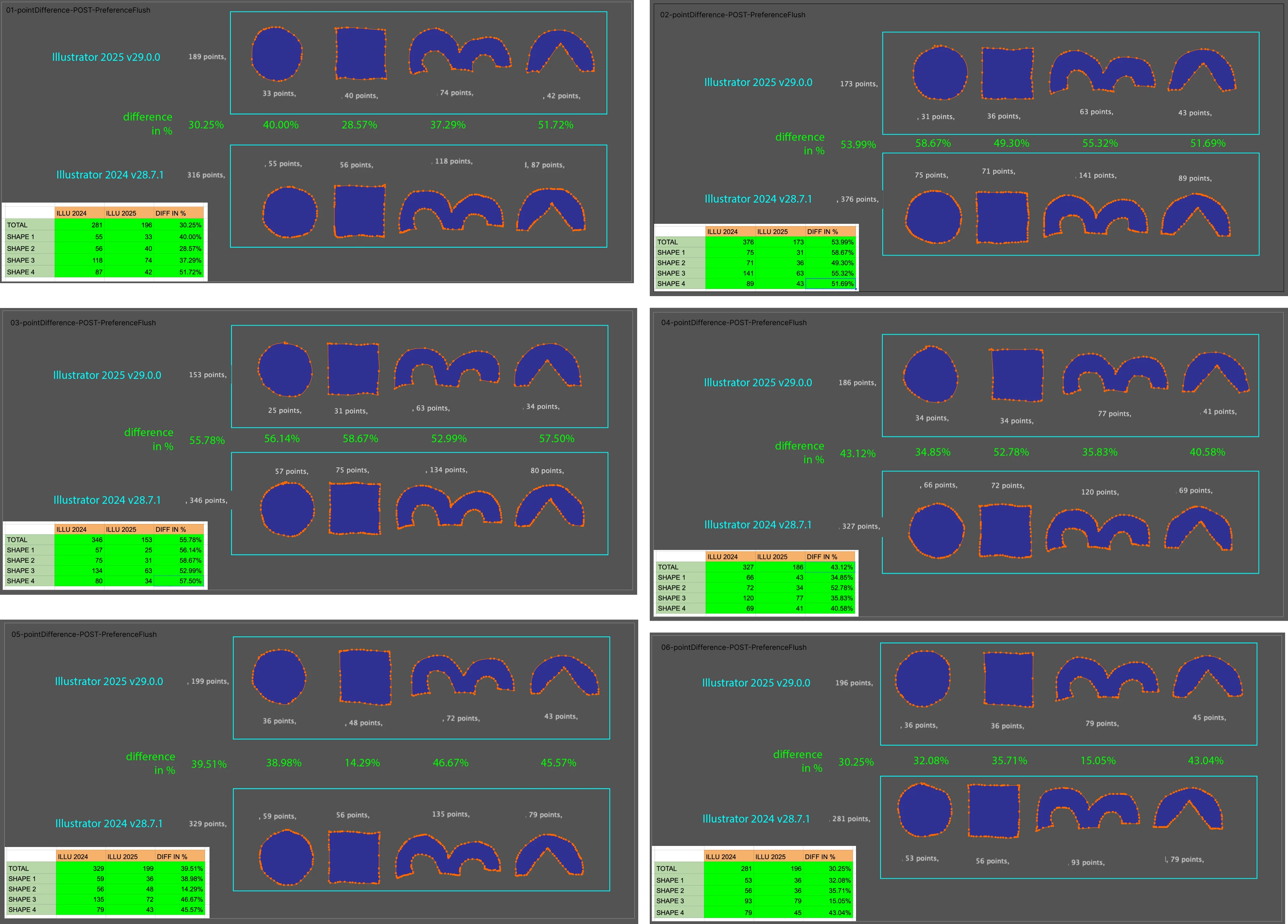 I've also conducted extensive testing several times under the same settings and same conditions, and you can see in my charts how much anchor point generation has changed when comparing Illustrator 2014 (v28.7.1) to the 2025 (v29.0) version. Even after the preferences reset on the first accuracy tick.