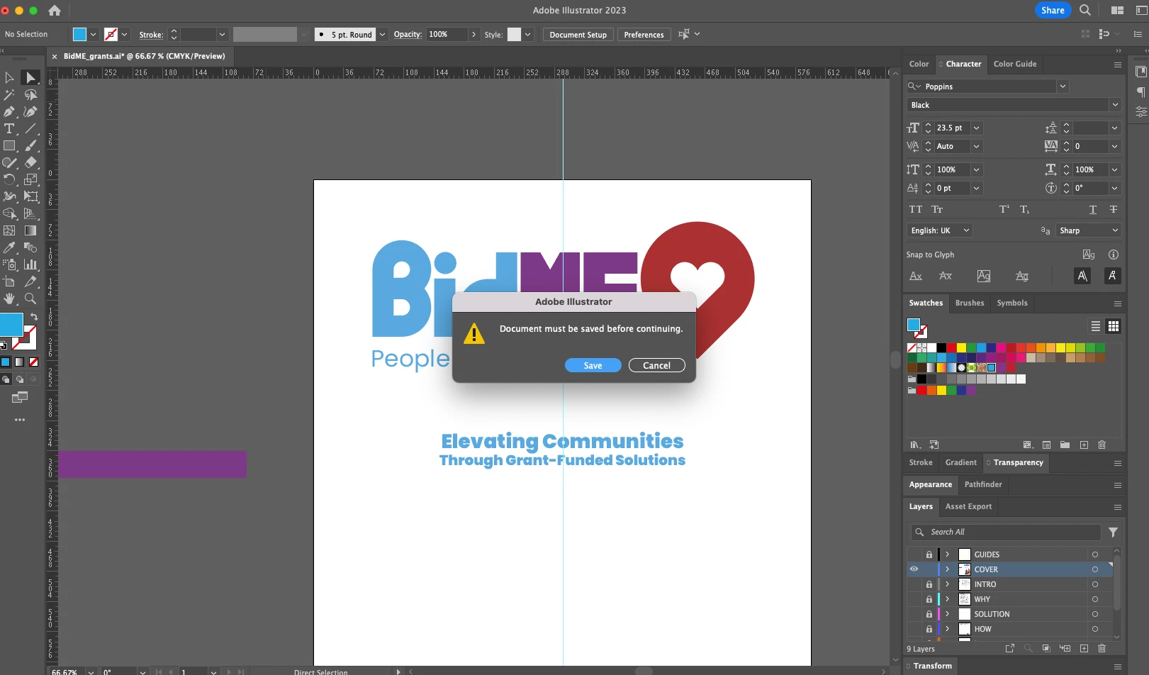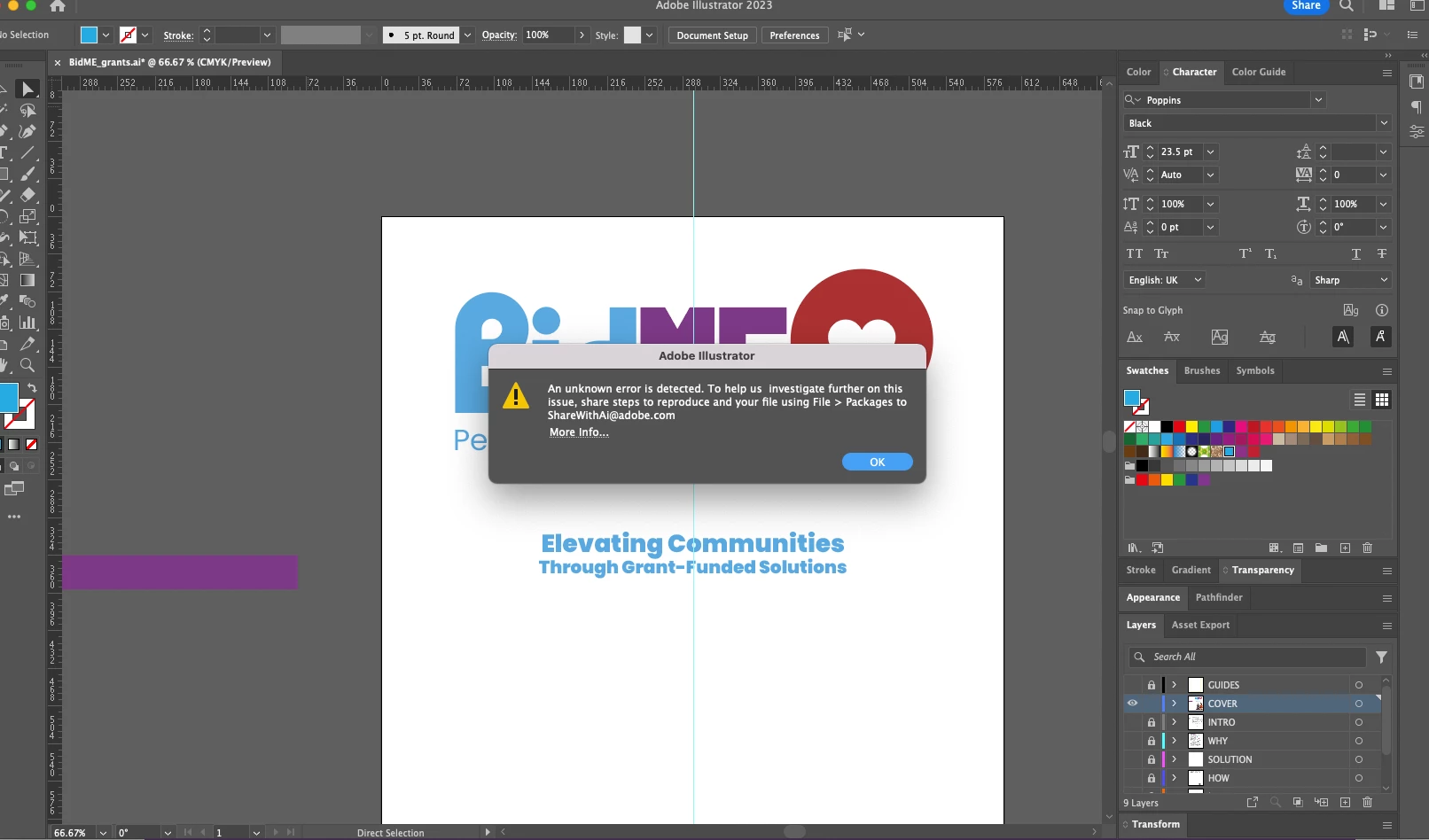 I spent yesterday making a large file in Illustrator using a font that is supplied by Adobe called 'Poppins'. The font is still present in my Creative cloud font management.