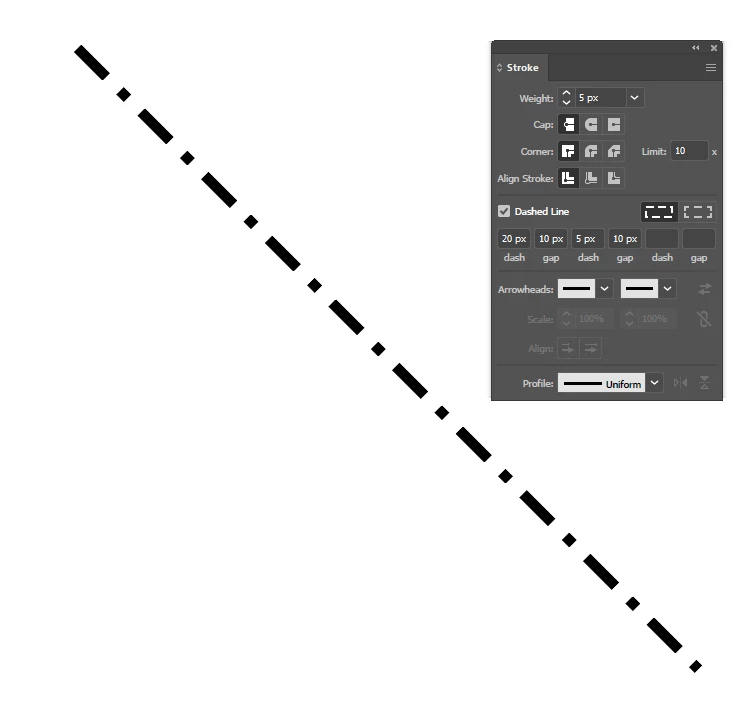 I'm trying to create a dashed line with alternating dash lengths. I've been playing with the "dash" and "gap" fields in the stroke options but can't figure out how to make the dashes uniform, where every other dash is long, and every other one short, with the same gap for each. I want it to look something like this (I didn't create the image below) -