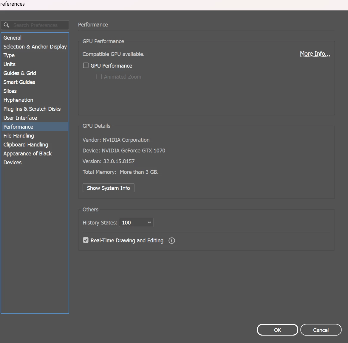 I’ve tried both CPU & GPU performance, toggling them both on and off, disabling animated zoom, updating my NVIDIA studio driver, restarting my computer. I also tried to switch to GPU view, but that option is disabled for me.