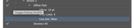I am trying to make an action that has many steps. One of the steps is a Menu Item which is Effect > Path > Path Offset. When I execute the the action, Path Offset window pops up and wait for me to enter values (Offset, Joins). I enter Offset: 0.1 mm, Joins: Round then I click Ok for the action to continue. I am looking for a way to set these values automatically so the action continues without me entering the same values every time.