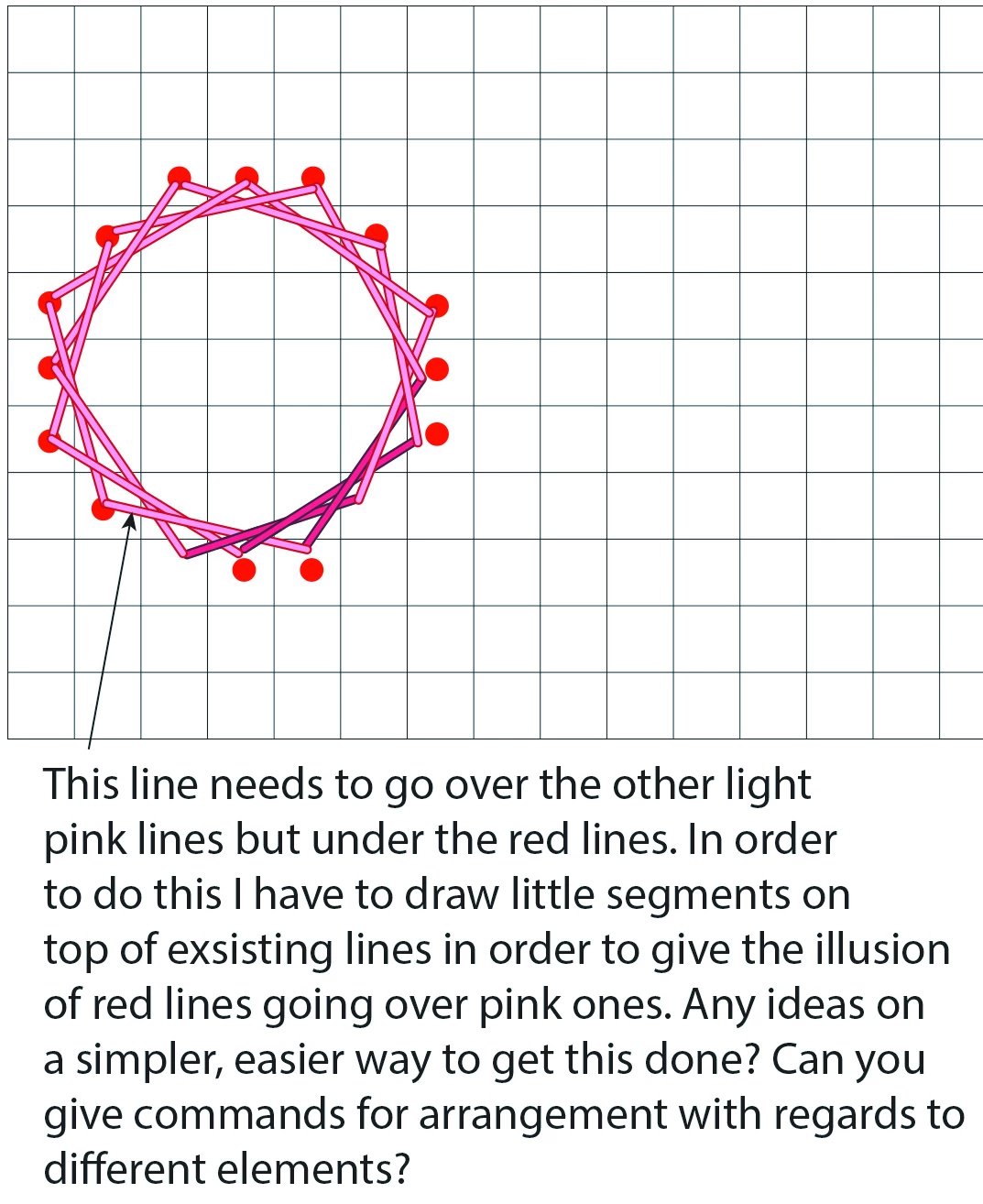 I am looking for a solution to an ongoing illustration need I have. I draw diagrams with expanded lines that need to go over some lines and under others. Arrange to front or back only allows me to use a command for the entire line so it will always only be above other lines or below them. If I could give commands of arrange/bring to front with relation to a specific grouping and arrange/bring to back with relation to a different grouping that would be wonderful. Any ideas? The photo I've attached took me 30 minutes to draw and perfect, way too long!