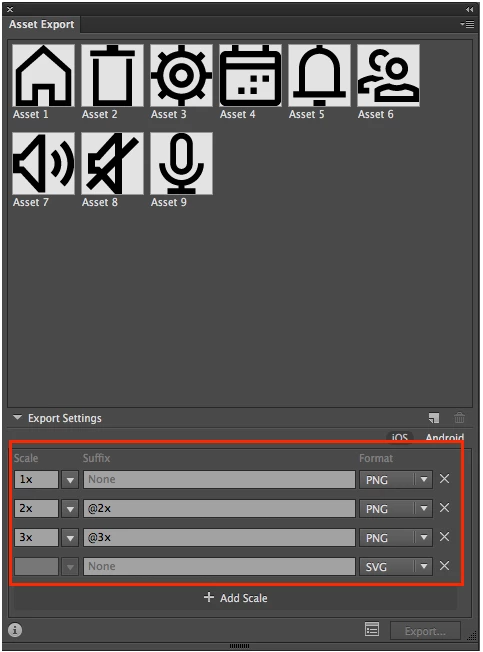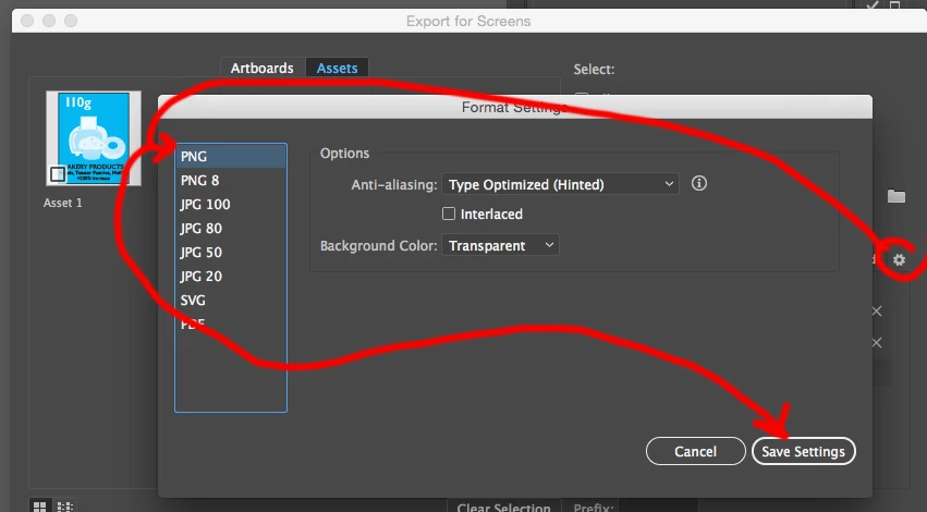 Asset export, save export settings