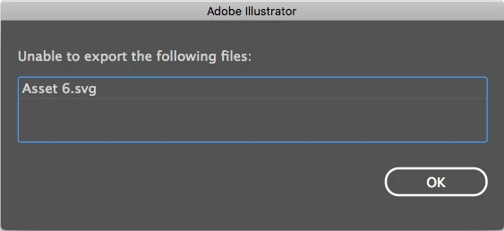 Using Version 23.1.1 — Today, I experienced this error on one specific file of a handful of similar AI files. Performing the same process on each file: converting a very simple group of artwork into an Asset Export item, exporting SVG and PNG versions with my preferred settings all with great success. When I got to one file in the group, it repeatedly gave me this message while trying to export svg and png alike...