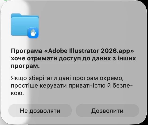 And one more thing, maybe this is the reason. Every time I start the program «««««Adobe Illustrator 2026.app» wants to access data from other programs. If you keep the data of the programs separately, it is easier to manage privacy and security. ≥≥≥≥≥≥≥ It does not matter whether I allow or deny, but still, the next time I start, it asks the same thing again. Reinstalling Illustrator did not help.