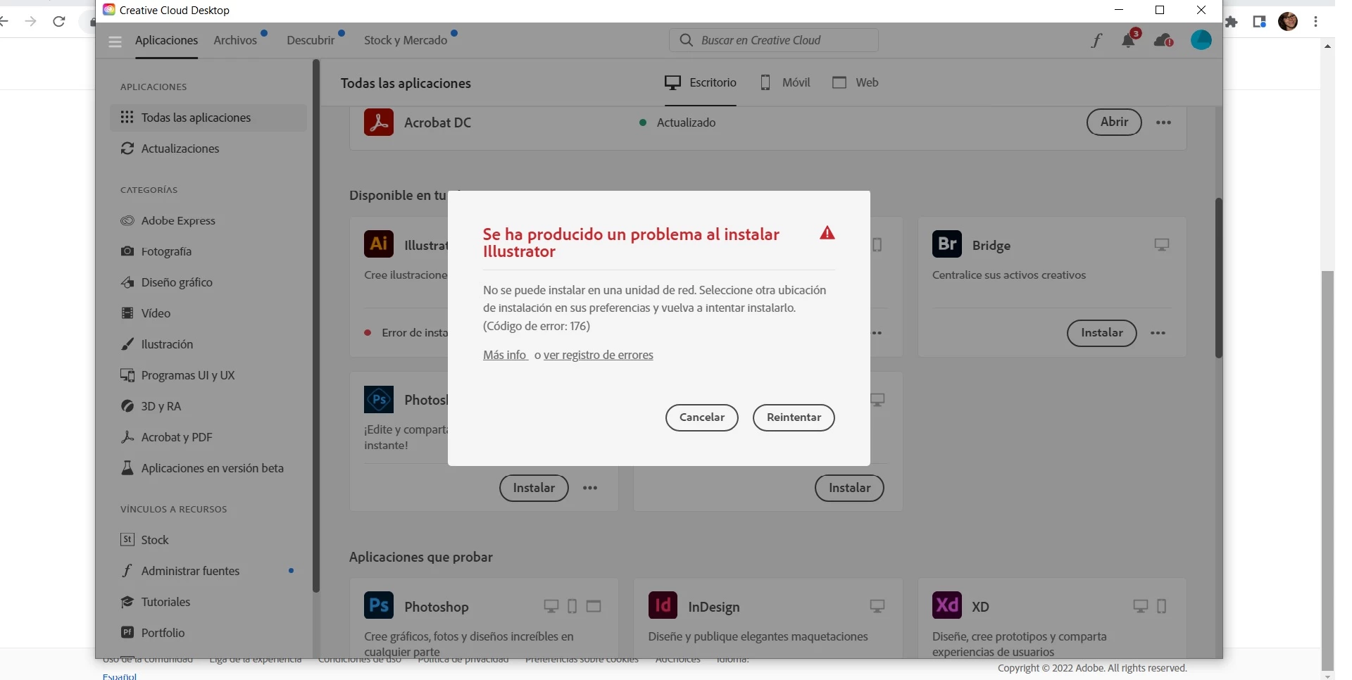 Hola! Ya publiqué este problema pero no obtuve ayuda, y como estoy pagando Illustrator necesito solucionarlo: Recienmente compré el Adobe Illustrator y al tratar de instalarlo en mi disco duro externo (mi computadora ya no tiene más espacio para otro programa) a través de Creative Cloud Desktop me tira el código de error 176, dice "El código de error 176 indica que intenta instalar la aplicación en una unidad de red. SOLUCIÓN: Seleccione otra ubicación de instalación en las preferencias del dispositivo e instale de nuevo la aplicación." Pero esto no puede ser ya que ya había podido instralar Illustrator en otro disco duro (que se me rompió) y no había tenido ningún tipo de problema. ¿Porqué ahora si?
