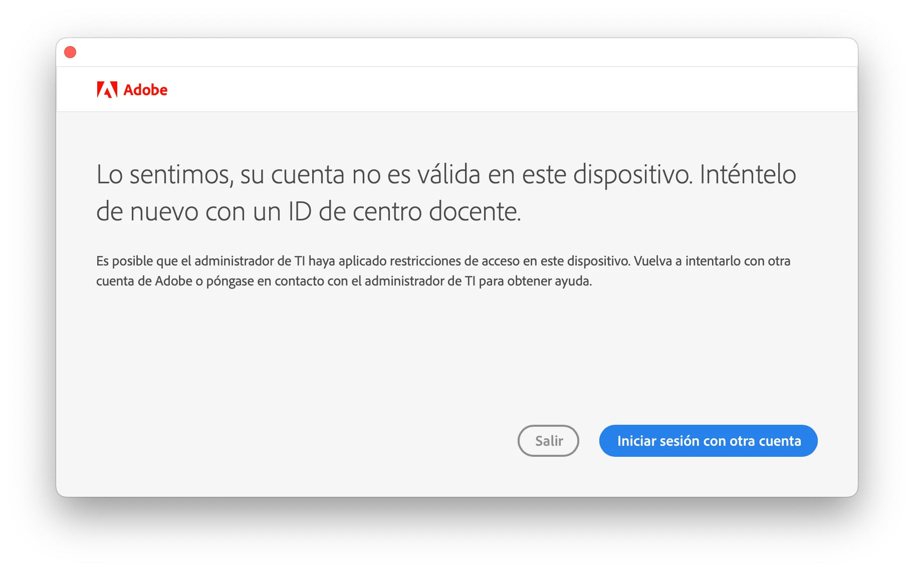 Hola! ¿Alguien podría ayudarme a resolver este problema? Actualicé mi licencia porque anteriormente me aparecía este mensaje y ahora que instalé los programas de nuevo sigo sin poder abrirlos por este mismo mensaje. Cambié mi correo electrónico, desinstalé todo desde mi computadora y ya no sé de qué otra forma puedo hacer para que funcione 😞